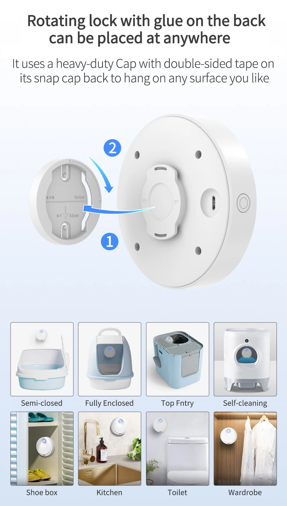 El desodorante utiliza una tapa resistente con cinta de doble cara en su tapa trasera para colgar en cualquier superficie que desee, para que puedas encajar fácilmente el desodorante en la tapa girándolo, pero el gato no pueda rascarlo.