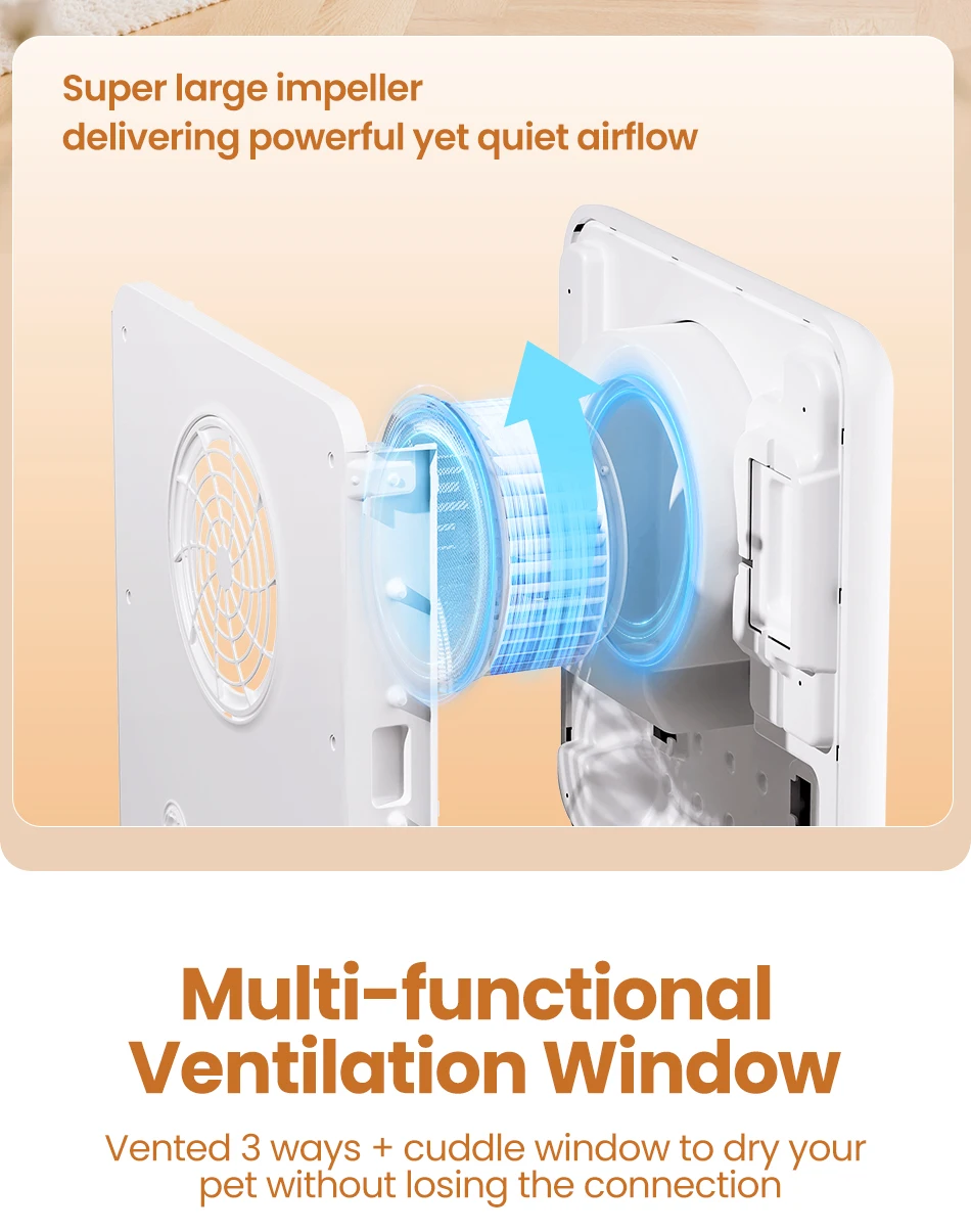 2.Secado suave: Para mascotas jóvenes/ancianos/sensibles.37℃ brisa suave con poco ruido