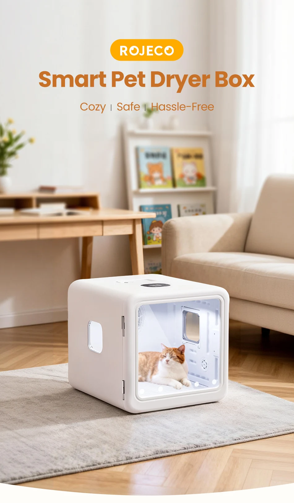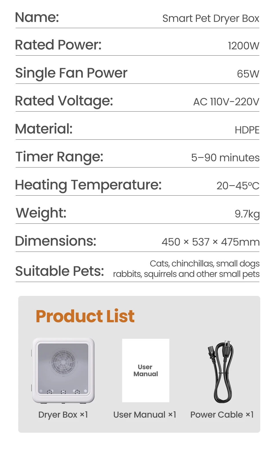 Aire en la caja: entrada de aire de dos canales, el 70% del aire circulante garantiza una temperatura más estable en la caja de secado y el 30% del aire fresco ingresa a la caja para mantener la ventilación natural fuera de la caja y permitir que las mascotas respiren mejor..