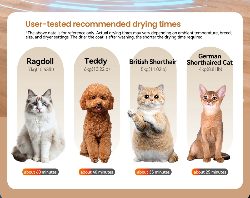 Los datos anteriores son solo de referencia.Los tiempos de secado reales pueden variar según la temperatura ambiente, el tamaño de la raza y la configuración de la secadora.Cuanto más seca el abrigo después del lavado, menor será el tiempo de secado necesario.