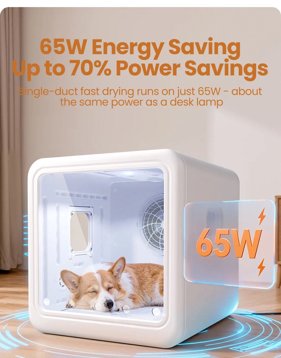 La cámara de secado inteligente con una gran capacidad de 70 litros está diseñada para satisfacer las necesidades de diversos tipos de mascotas (gatos, perros pequeños y medianos). Las habitaciones grandes ayudan a reducir la ansiedad y el miedo de los animales.