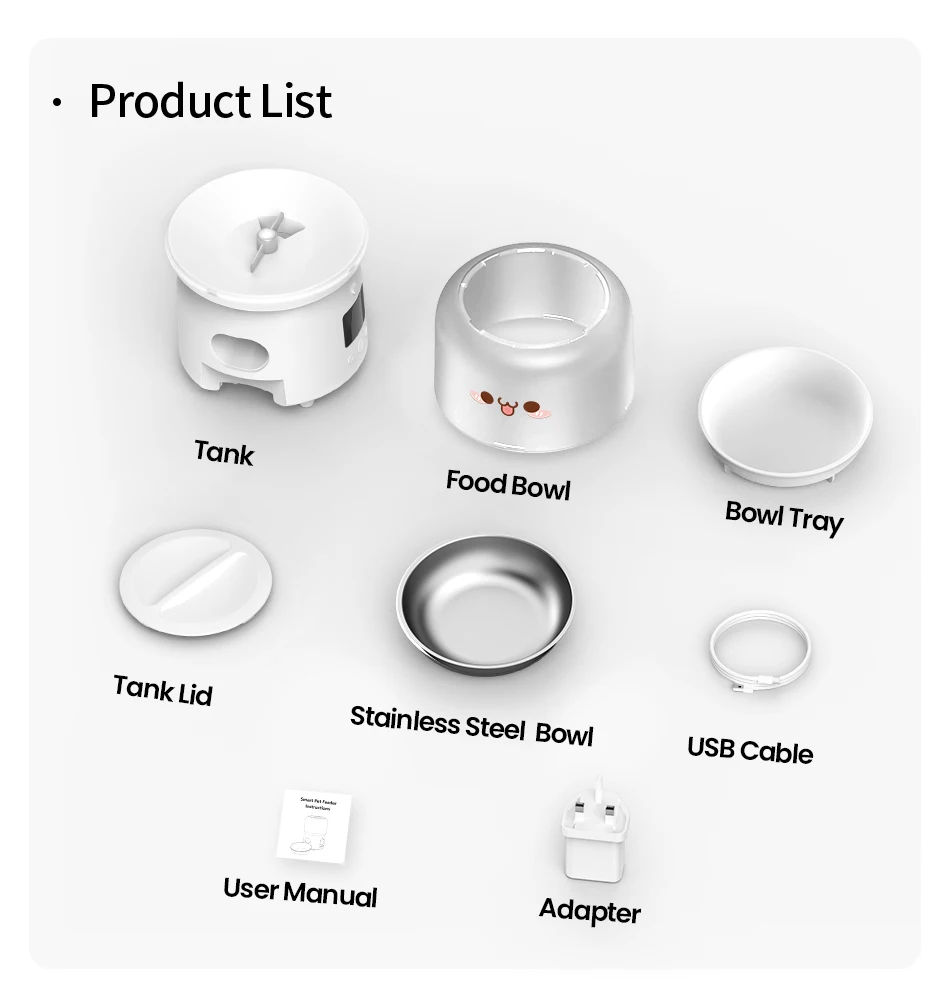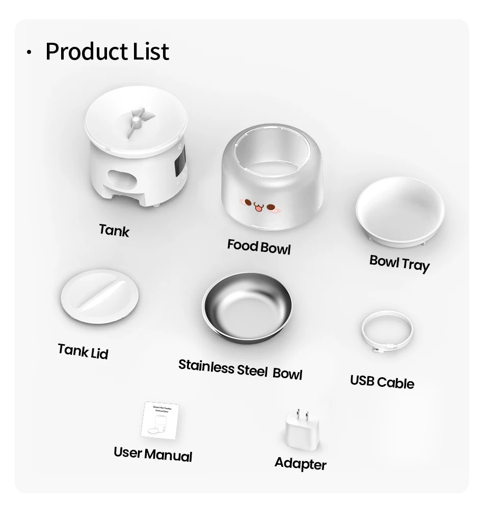 Lista de productos:Tanque, tazón de comida, bandeja de tazón, tapa de tanque, tazón de acero inoxidable, cable USB, manual de usuario, adaptador.