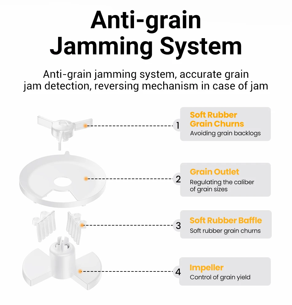 5.Salida de grano más amplia para múltiples granos.Salida de grano mejorada para ampliar, admite alimentos secos/congelados con un regulador de 2 a 20 mm.