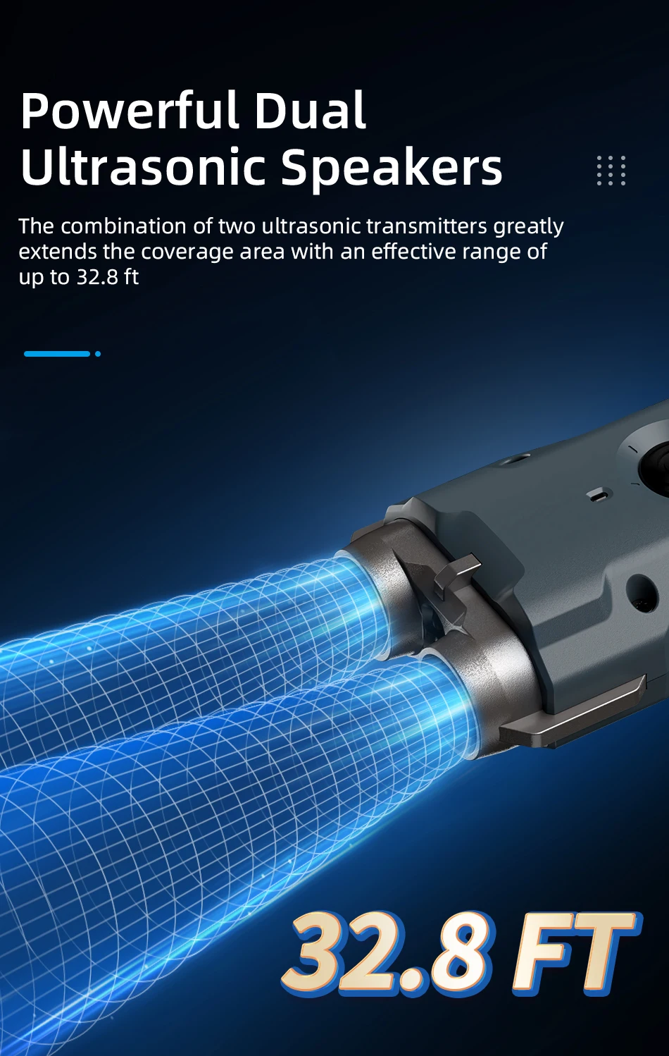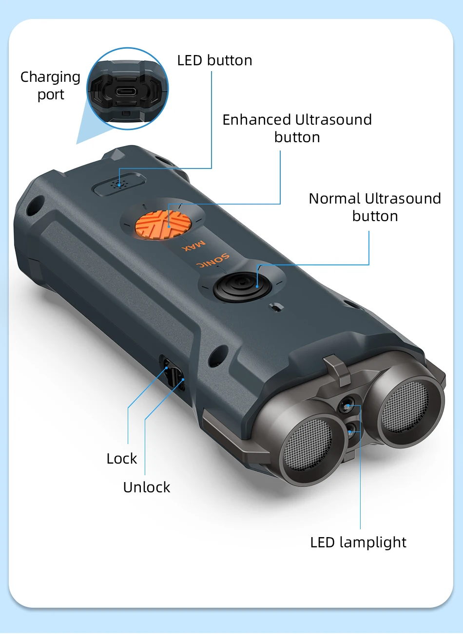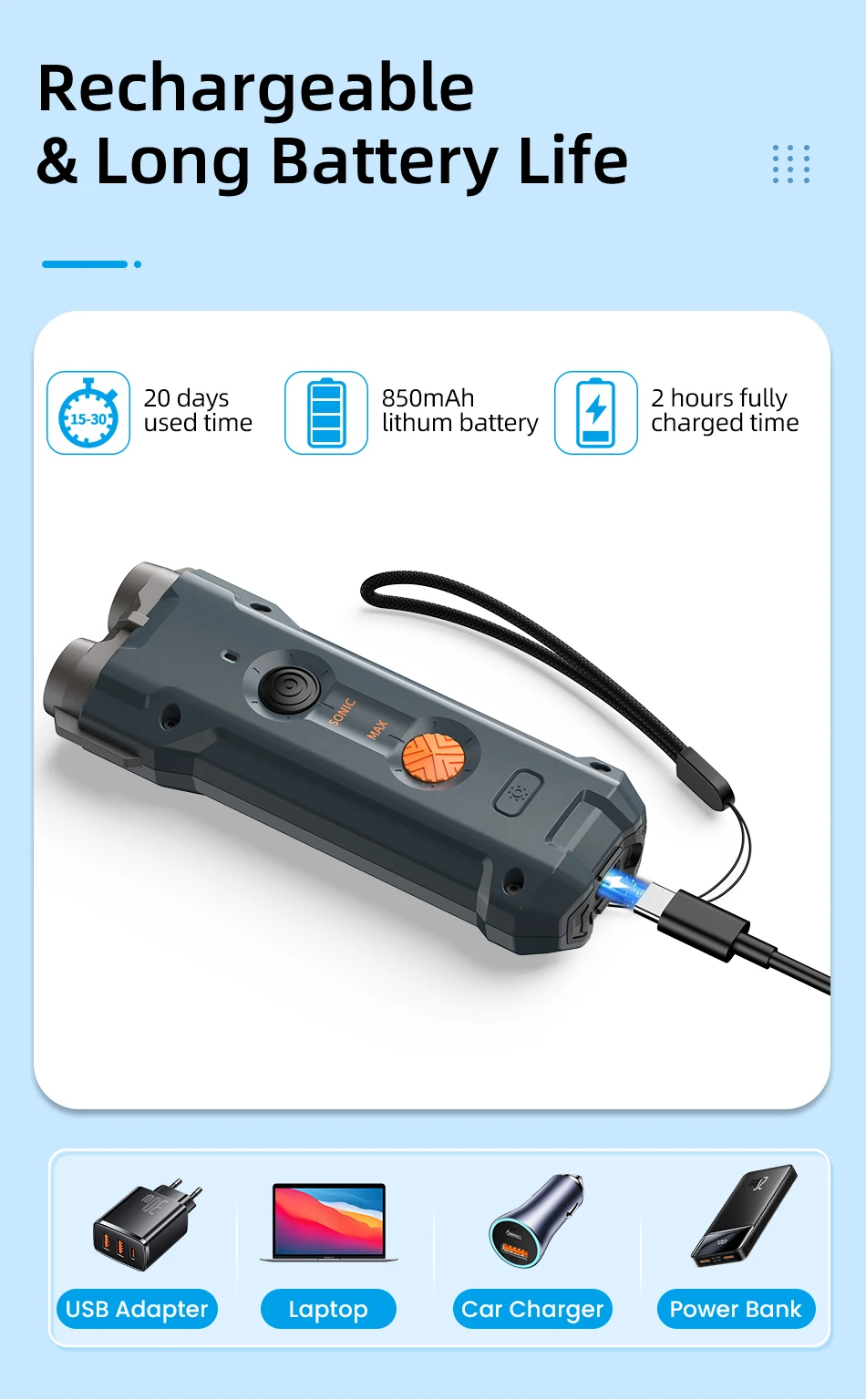 Hecho de plástico duradero, con baterías de carga tipo C. Emite ultrasuena porque las cuchillas reaccionan. El sonido se duplica en dos modos por el motor de vibración, hay una linterna. Lo usaré para entrenar a mi perro más tarde.