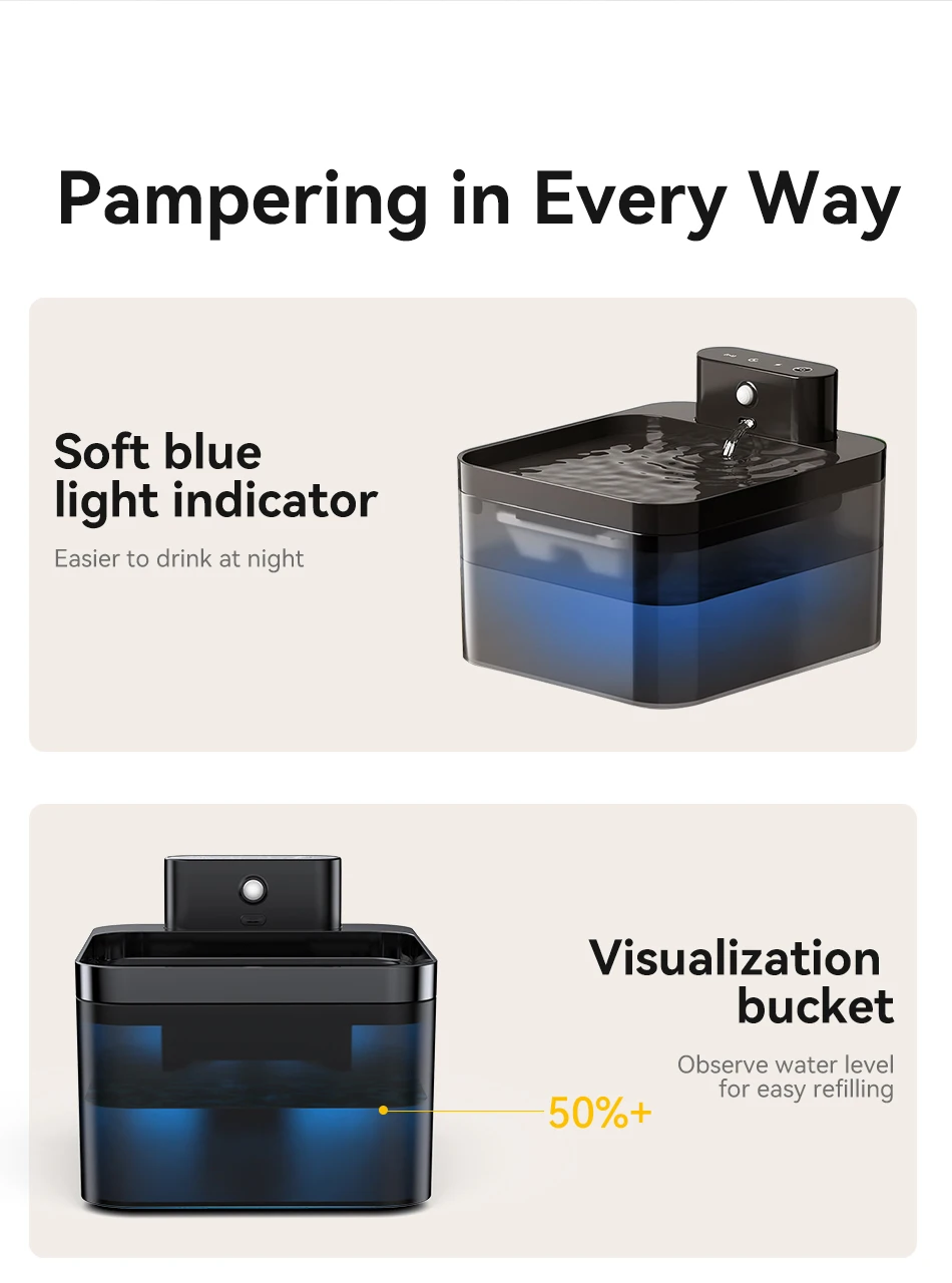 Tapa de fuente, silenciosa, sensor de movimiento sensible, retroiluminación fría que muestra el nivel de agua en el interior.
