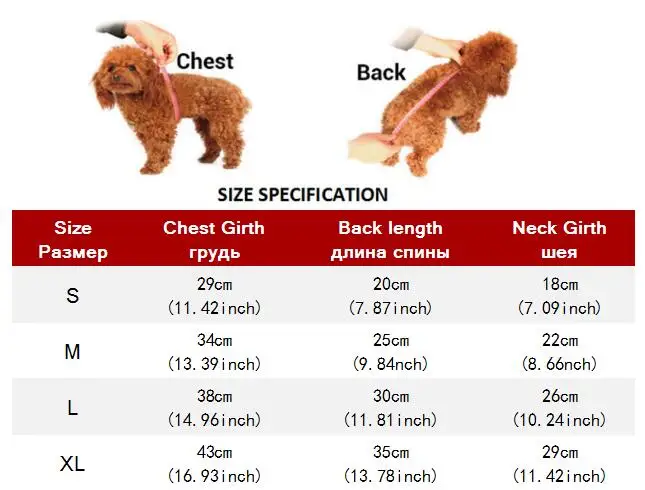 S: Longitud de la espalda: 20 cm/7,87 pulgadas, pecho: 29 cm/11,42 pulgadas, circunferencia del cuello: 18 cm/7,09 pulgadas.M: Longitud de la espalda: 25 cm/9,84 pulgadas, pecho: 34 cm/13,39 pulgadas, circunferencia del cuello: 22 cm/8,66 pulgadas.L: Longitud de la espalda: 30 cm / 11,81 pulgadas, pecho: 38 cm/14,96 pulgadas, circunferencia del cuello: 26 cm/10,24 pulgadas.XL: Longitud de la espalda: 35 cm / 13,78 pulgadas, Pecho: 43 cm/16,93 pulgadas, Circunferencia del cuello: 29 cm/11,42 pulgadas.
