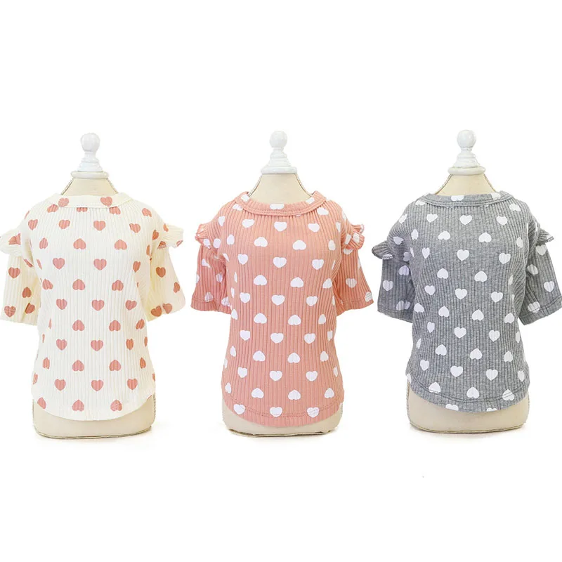 Ropa para mascotas de algodón rosa, Beige, gris, sudaderas con capucha para cachorros, camiseta con patrón de corazón, cuello redondo, suéter de manga corta de encaje, sudadera para perros pequeños