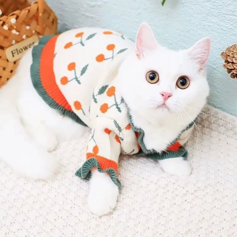 Ropa cálida de cereza para perros, suéter de Pomerania, caniche, punto de flores, Schnauzer, ropa de invierno para perros pequeños, ropa informal de dos patas