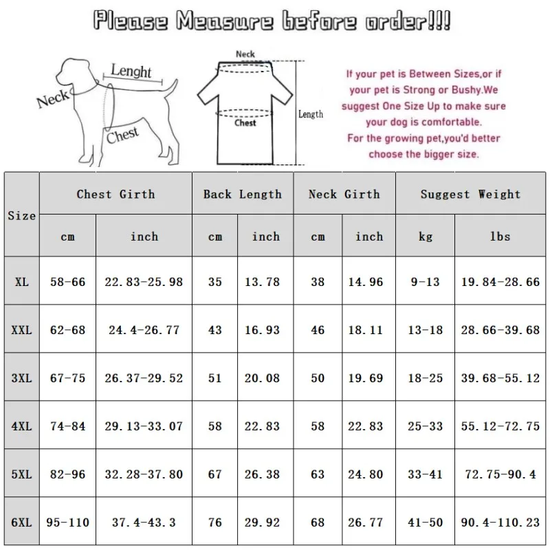 6XL: Pecho 95-110cm/37,4-43,3''; Longitud 76cm/29,92''; Cuello 68cm/26,77''; Peso sugerido 41-50 kg/90.4-110,23 libras.