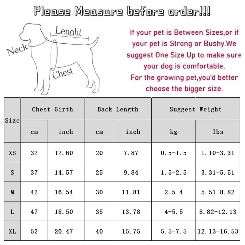 XS: Chest 32cm/12.6'' ; Length 20cm/7.87'' ; Suggest Weight 0.5-1.5 kg/1.10-3.31 lbs.