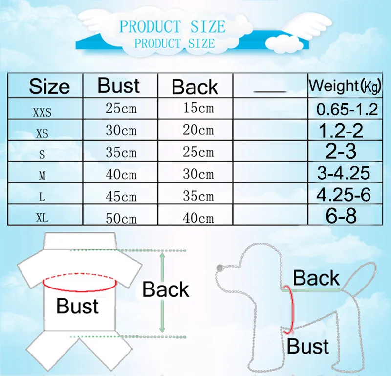 2. Para la ropa de dos piernas, preste atención a la circunferencia del pecho, y para las cuatro piernas, debe ajustarse a la circunferencia del pecho y la longitud de la espalda.