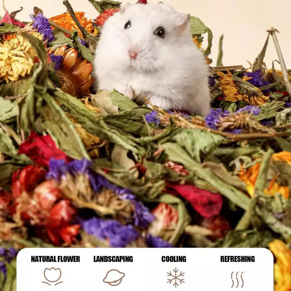 Esta ropa de cama para hámster está confeccionada con flores secas naturales que no contienen aditivos, proporcionando un ambiente seguro y confortable para tus amigos peludos.