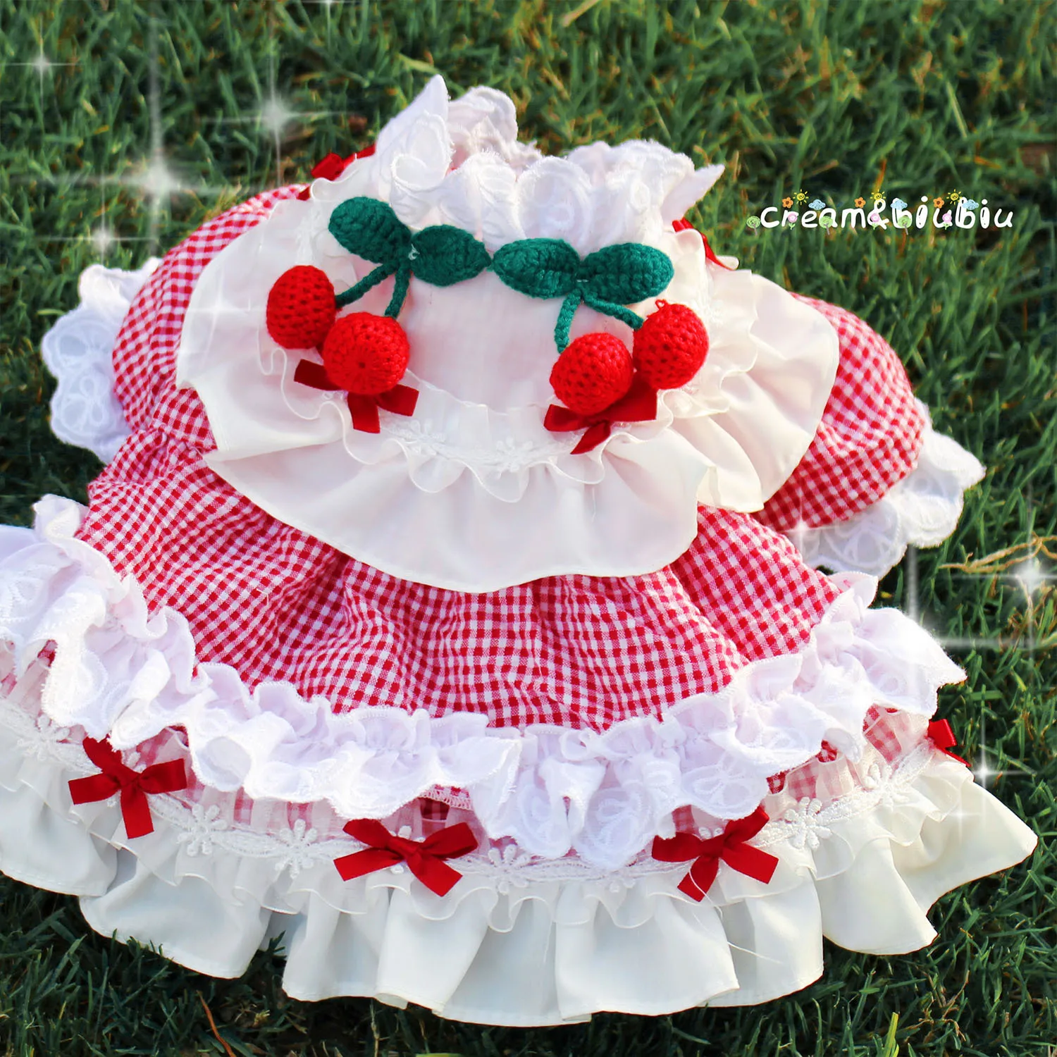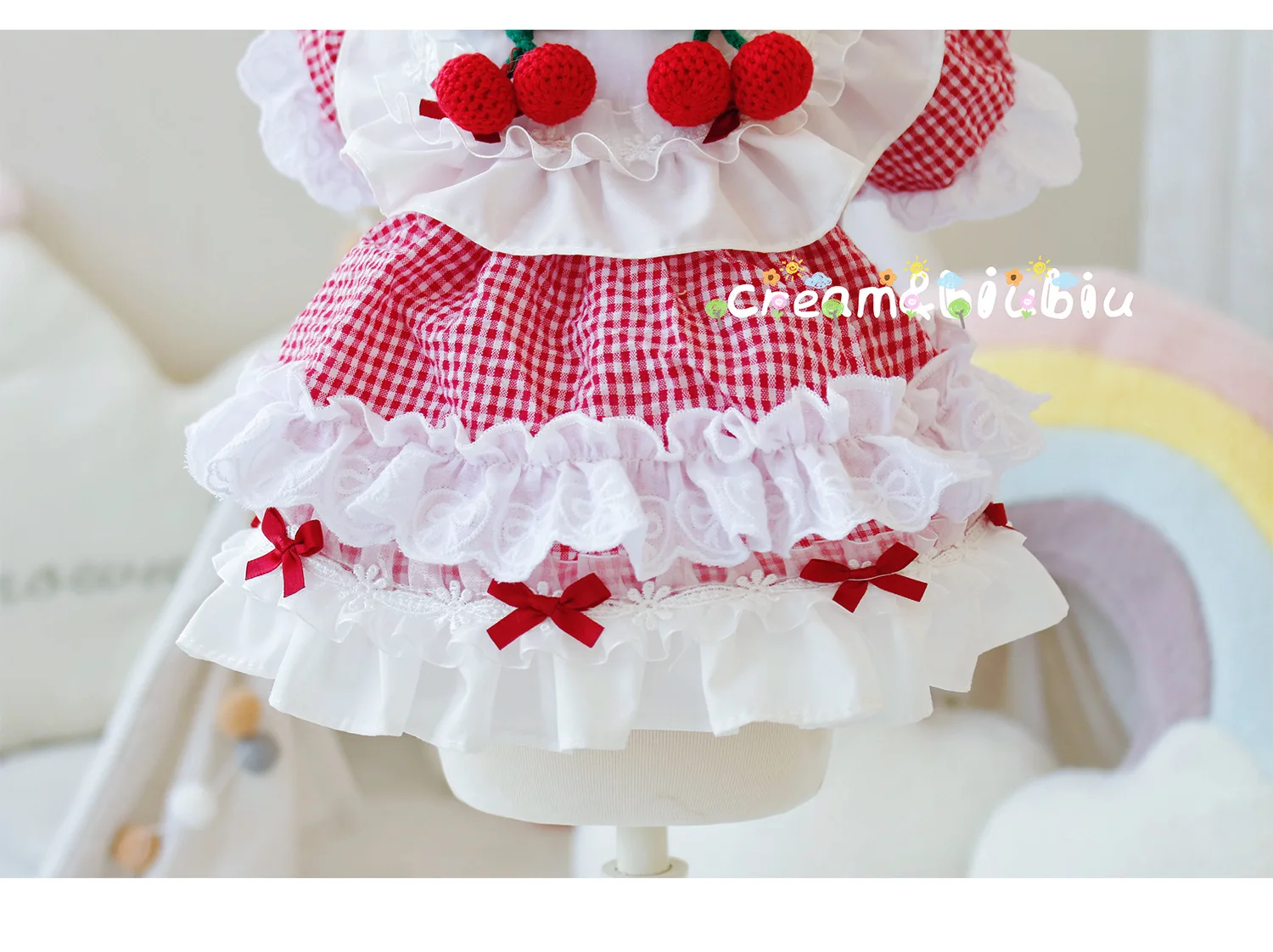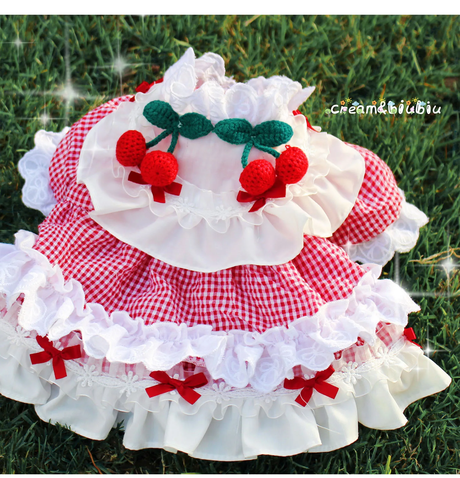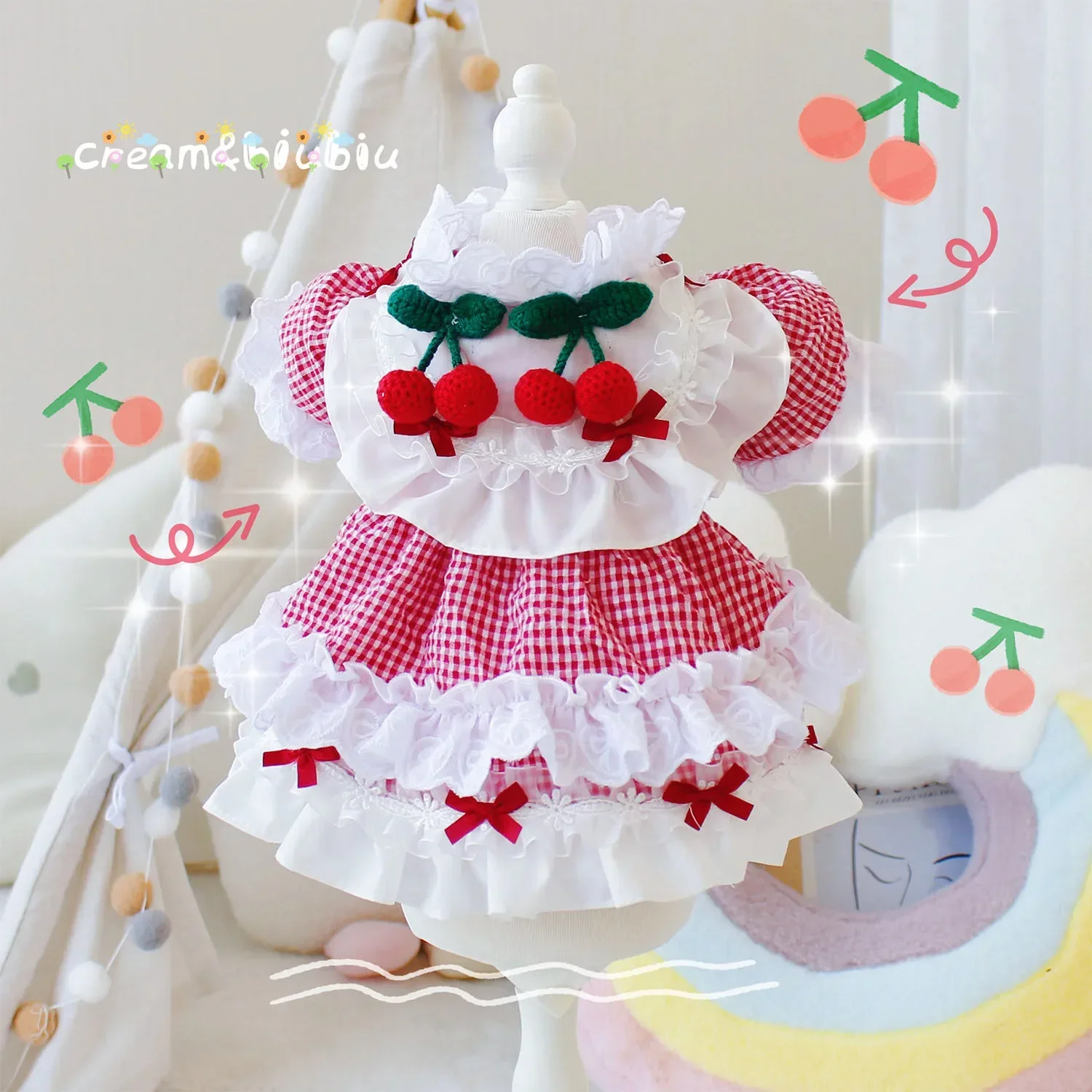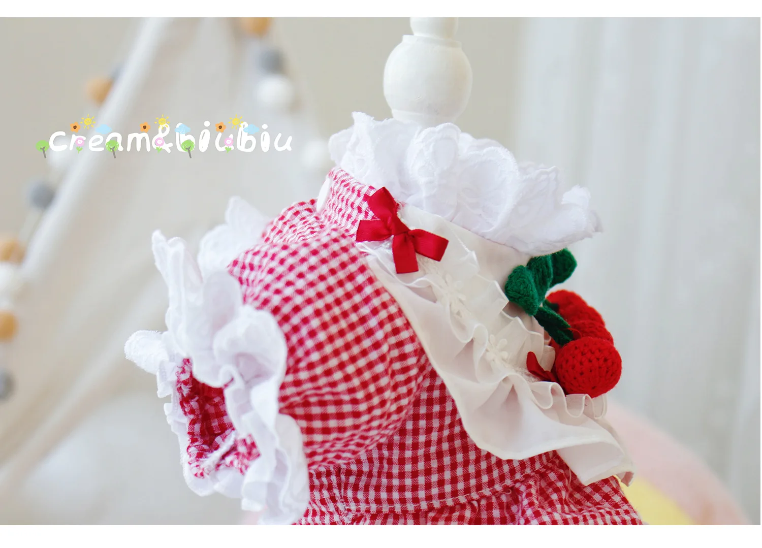 Ropa de cereza a cuadros para mascotas, vestido de sirvienta para primavera/verano para gatos, vestido a cuadros rojo cereza, oso de peluche, vestidos para perros pequeños