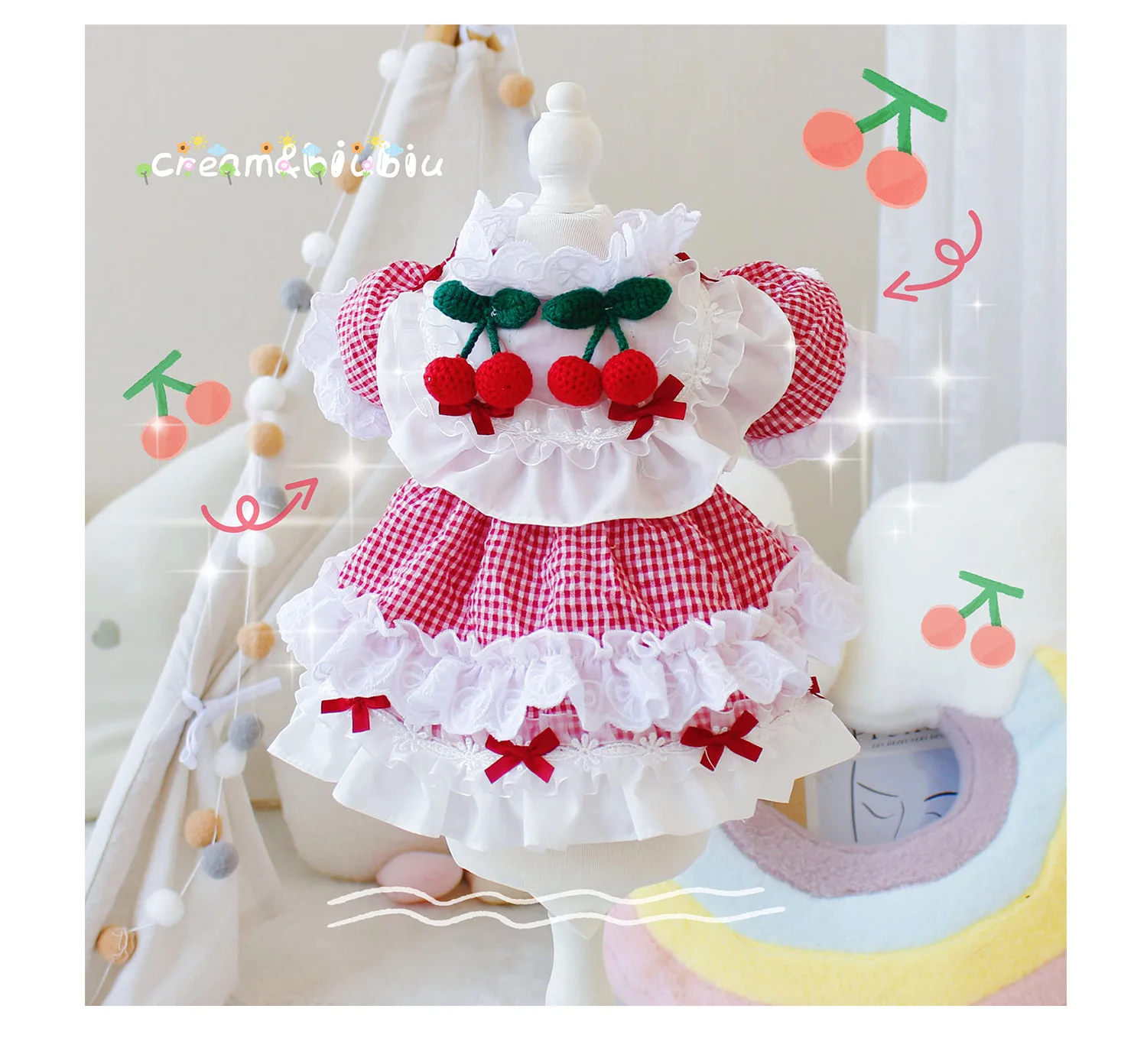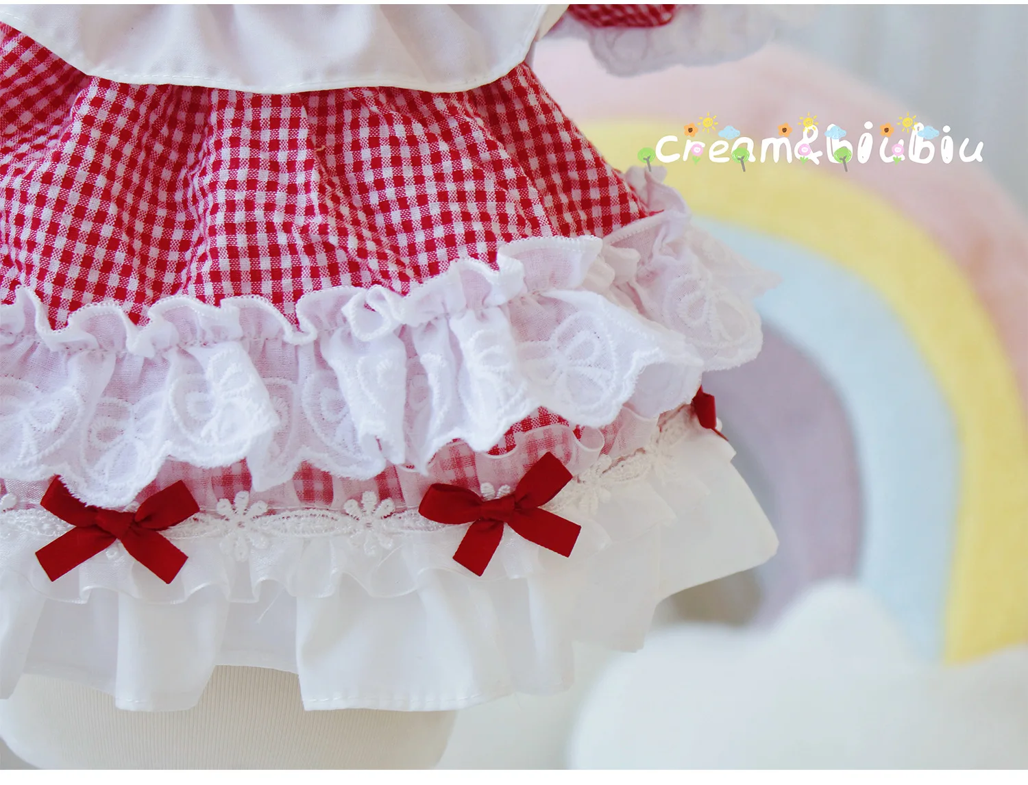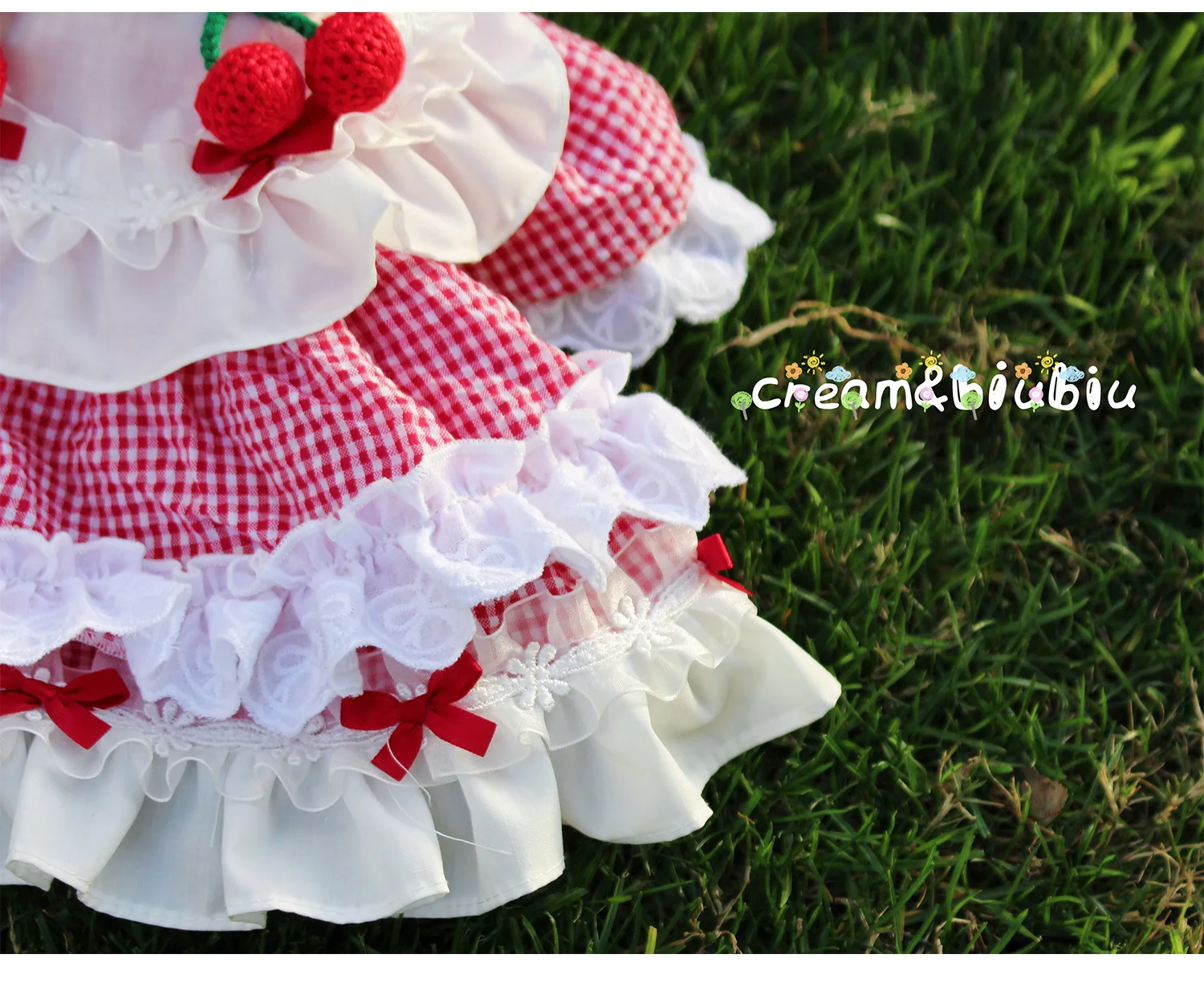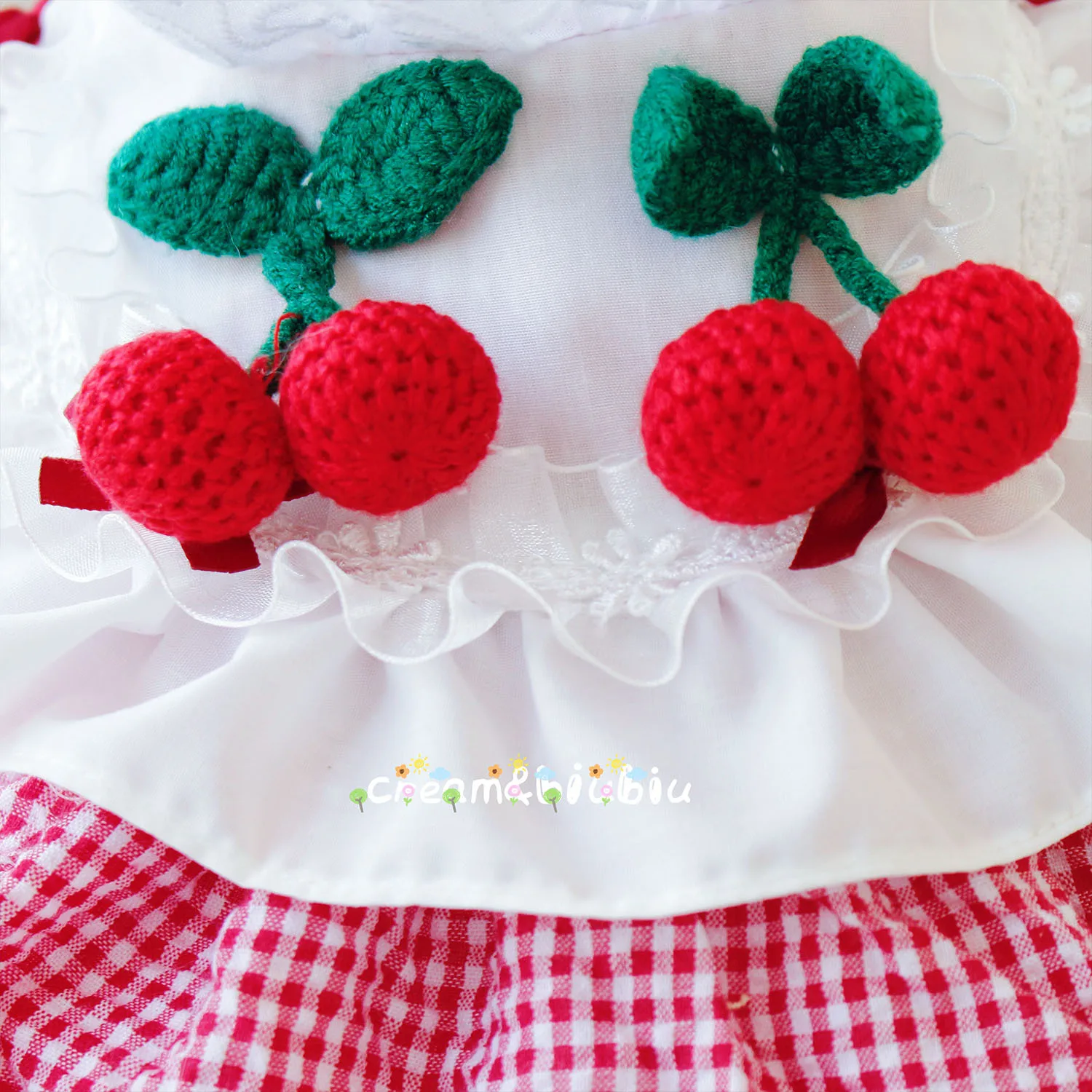 Ropa de cereza a cuadros para mascotas, vestido de sirvienta para primavera/verano para gatos, vestido a cuadros rojo cereza, oso de peluche, vestidos para perros pequeños