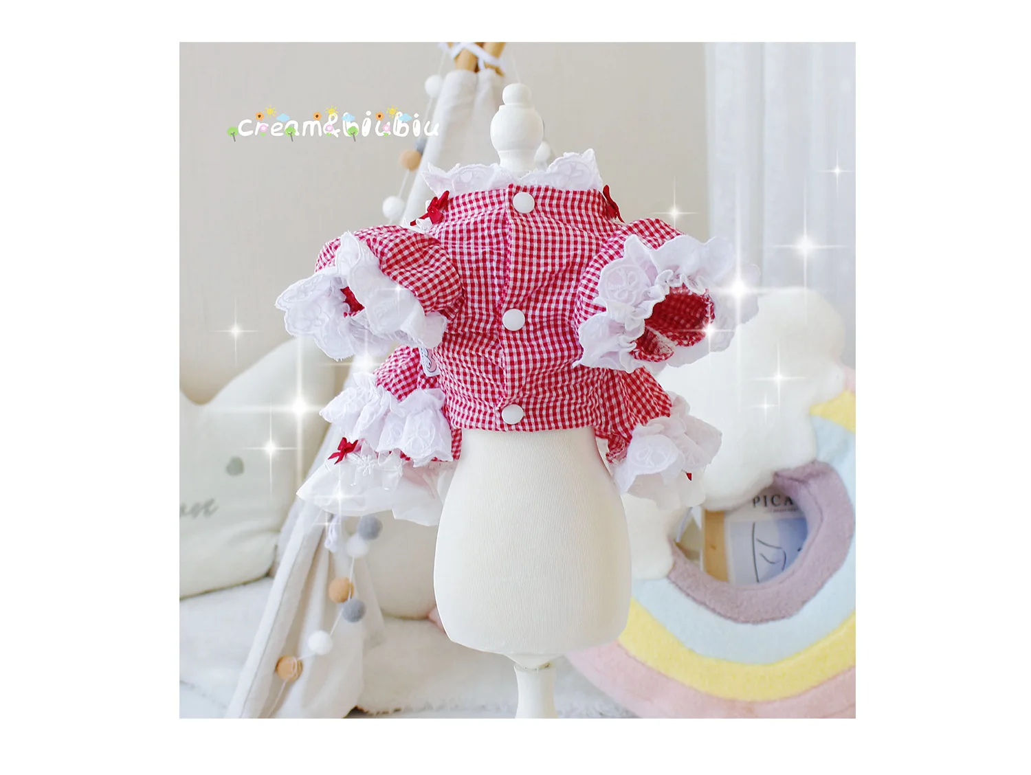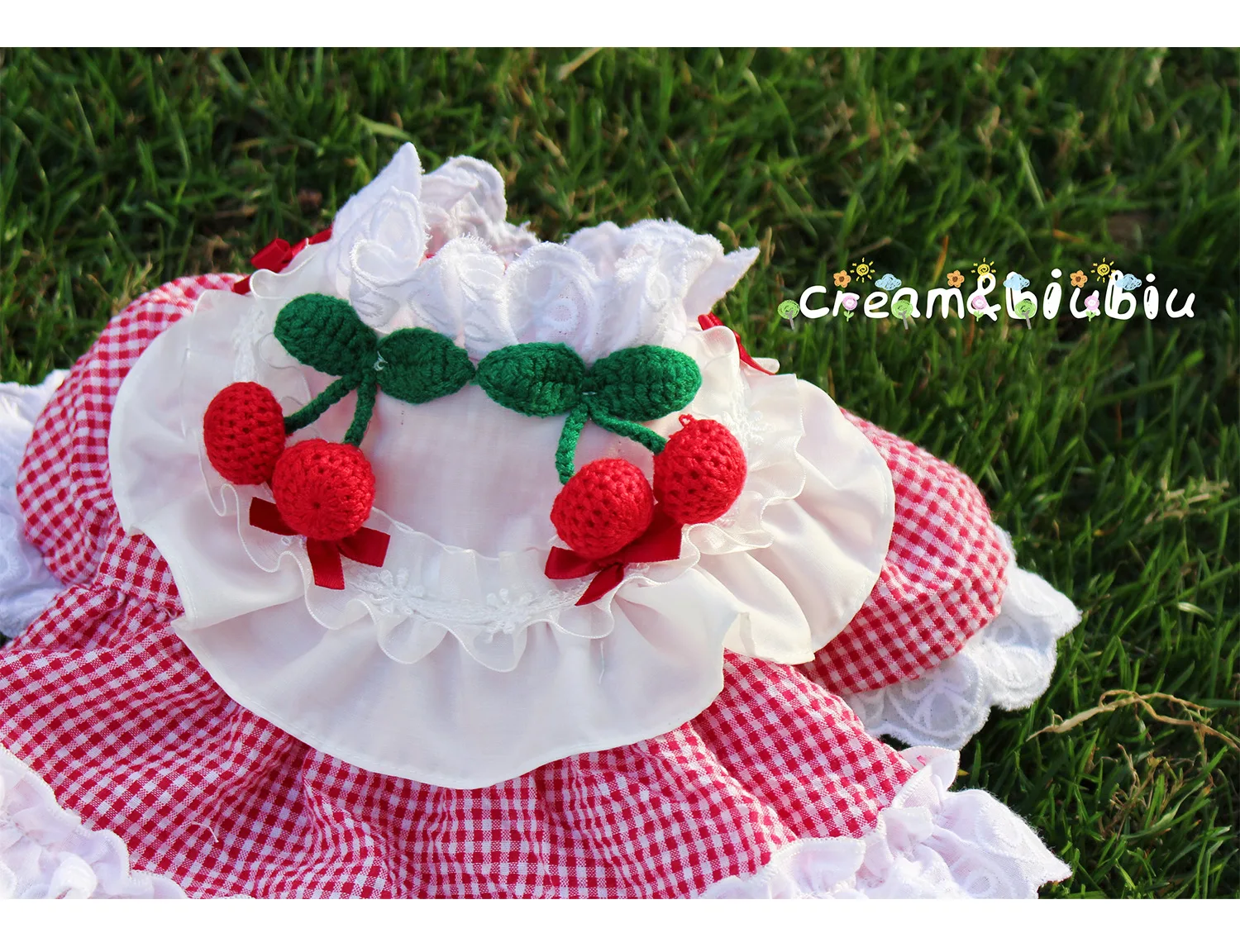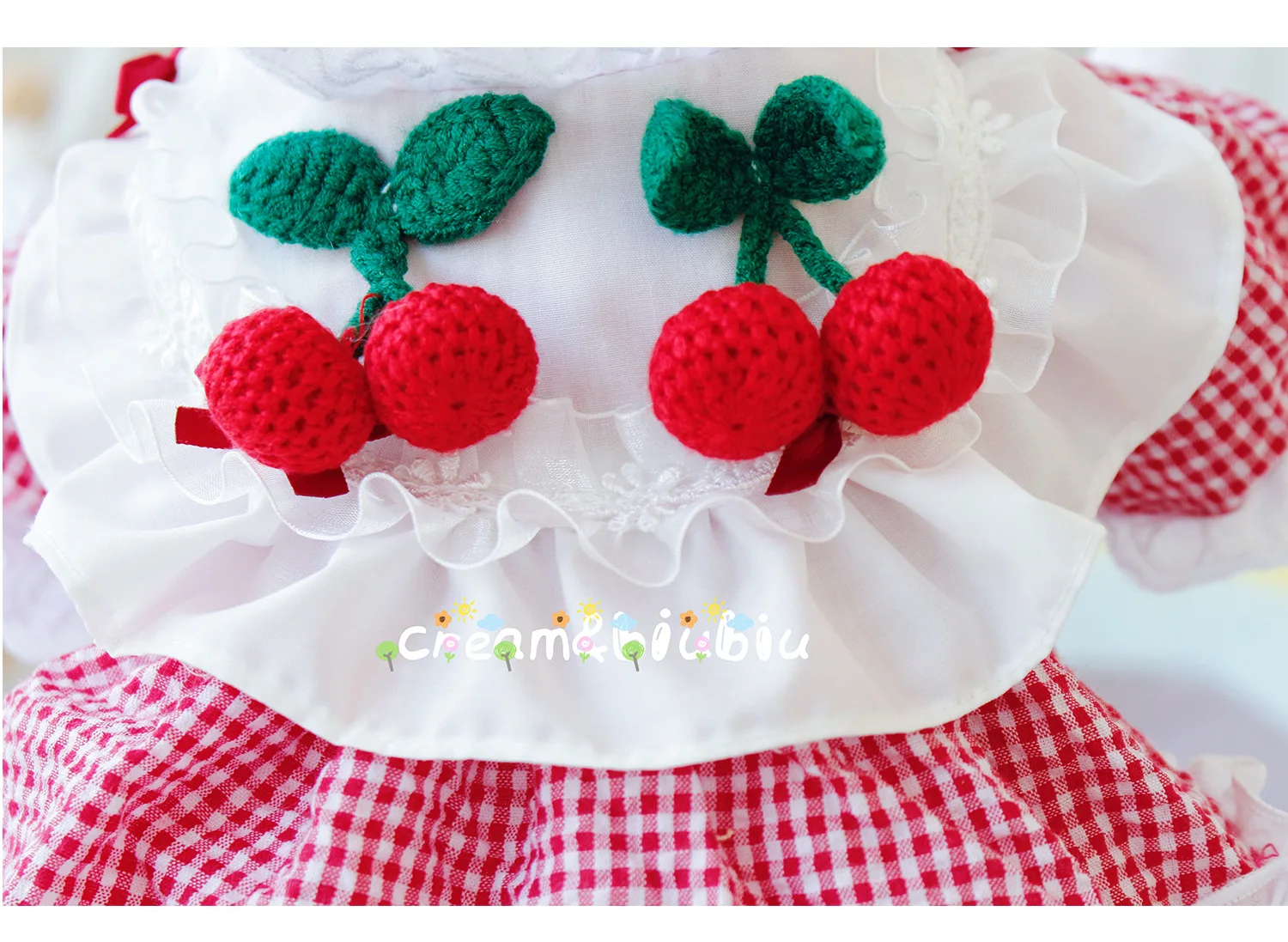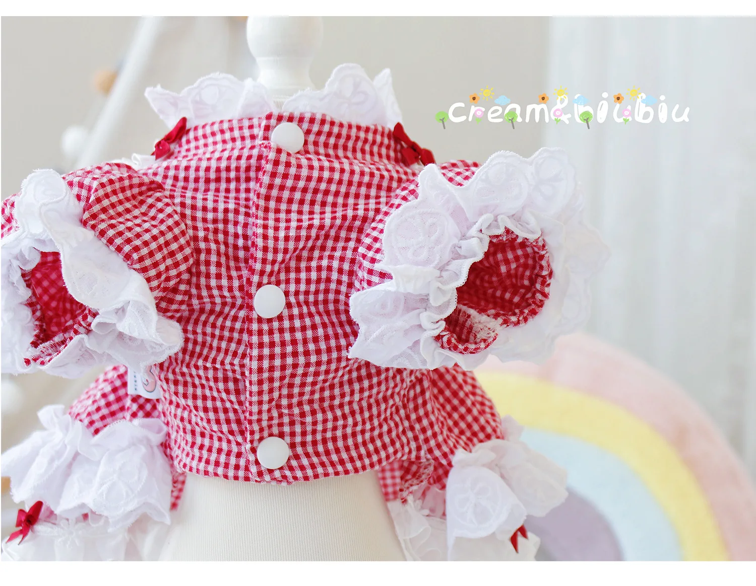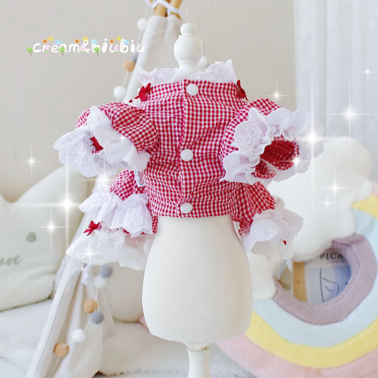 Ropa de cereza a cuadros para mascotas, vestido de sirvienta para primavera/verano para gatos, vestido a cuadros rojo cereza, oso de peluche, vestidos para perros pequeños