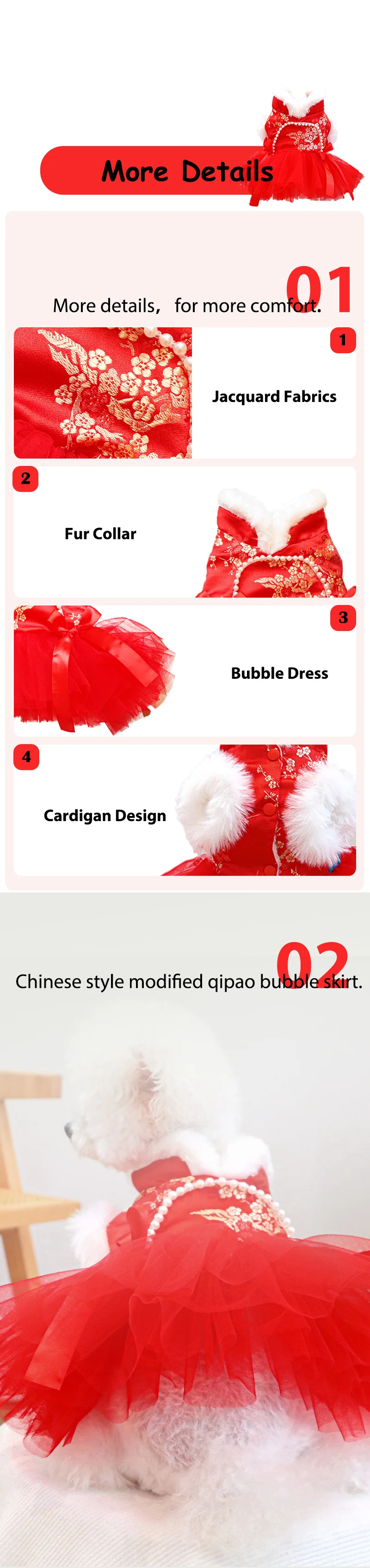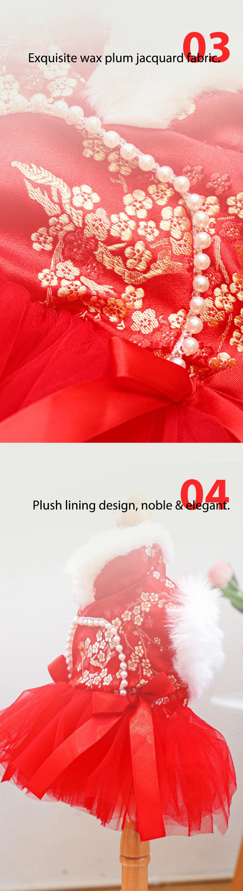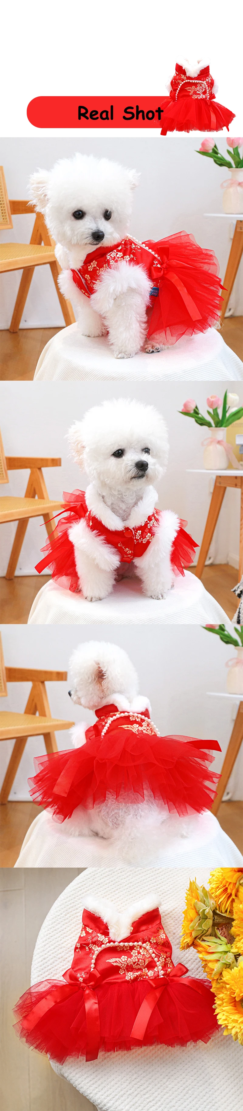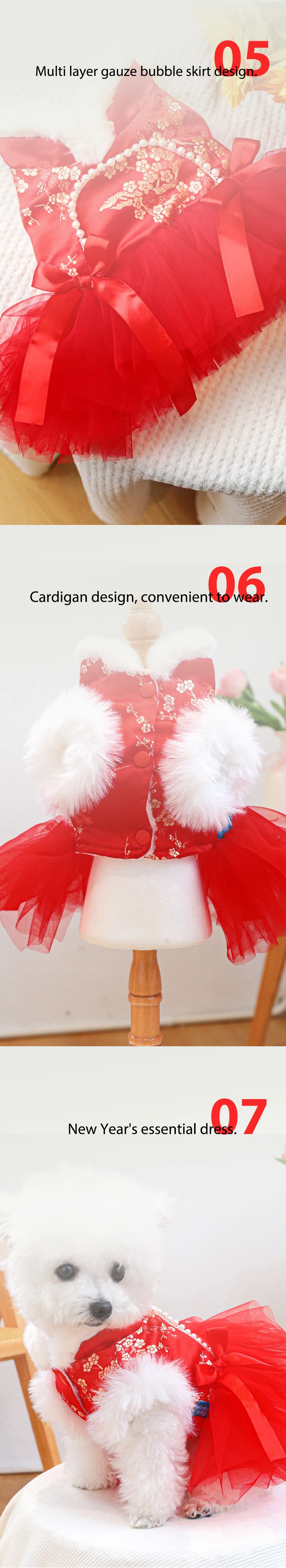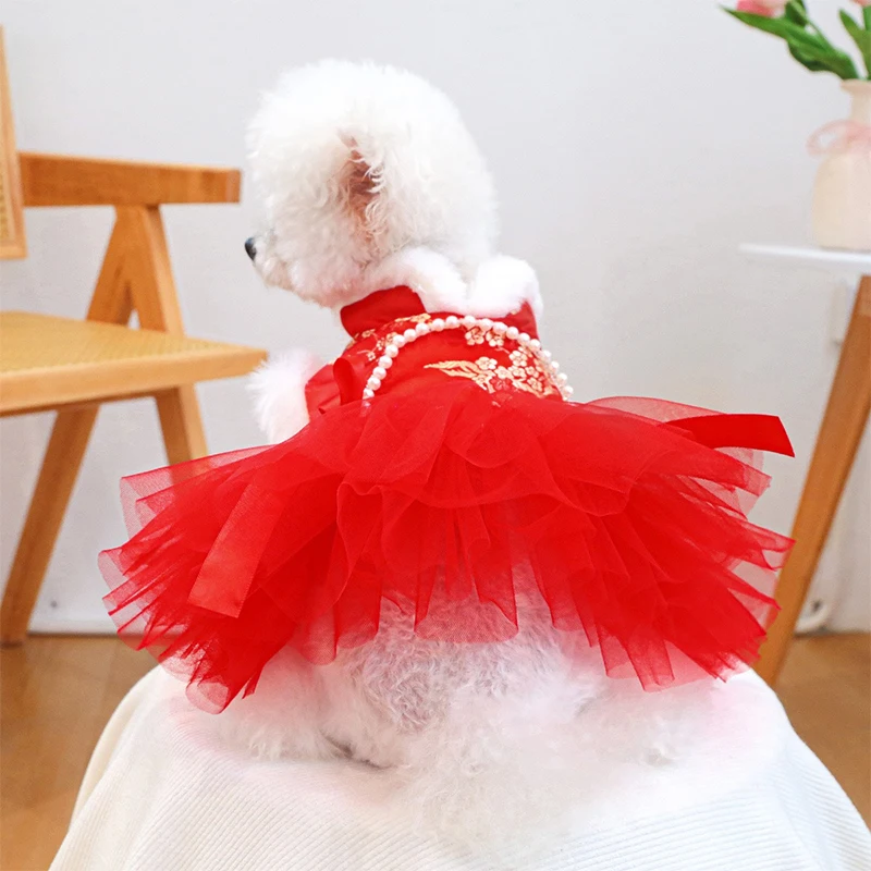 Ropa china antigua para perros y niñas, vestidos de Año Nuevo con Bulldog Francés para gatos, monos cálidos y esponjosos con flores doradas para cachorros y gatitos