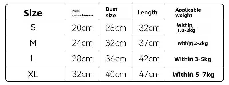 Tamaño, circunferencia del cuello, longitud de la espalda, circunferencia del pecho, adecuado para el peso.S 20 22 30 1-3M 24 25 35 3-5L 28 28 40 5-8XL 32 45 8-12