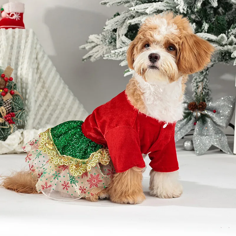 Ropa de fiesta cálida S-XL vestido navideño para perros tutú de terciopelo con purpurina y encaje, traje de invierno rojo/verde para mascotas para perros pequeños y medianos,