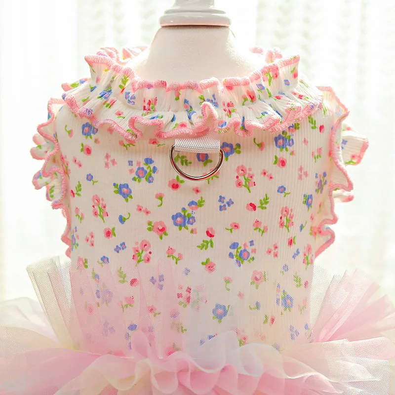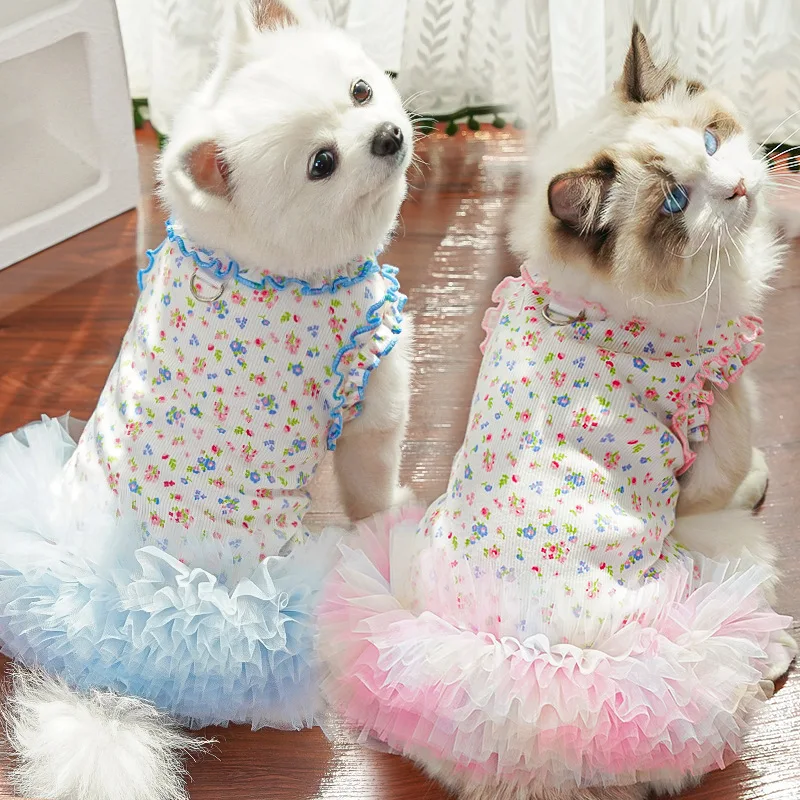 Ropa de perro con patrón Floral, vestido de verano rosa y azul para niñas con ropa con anillo en D para perros pequeños y medianos, falda de tul con gatito Dachshund