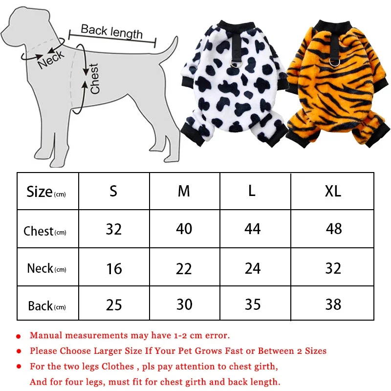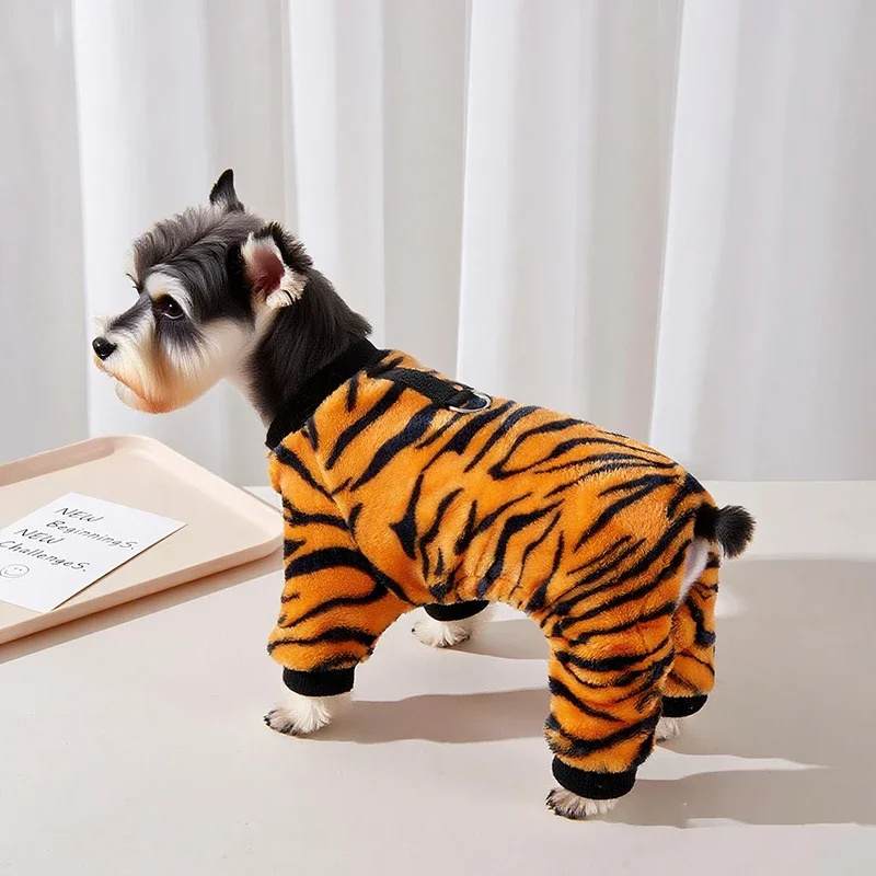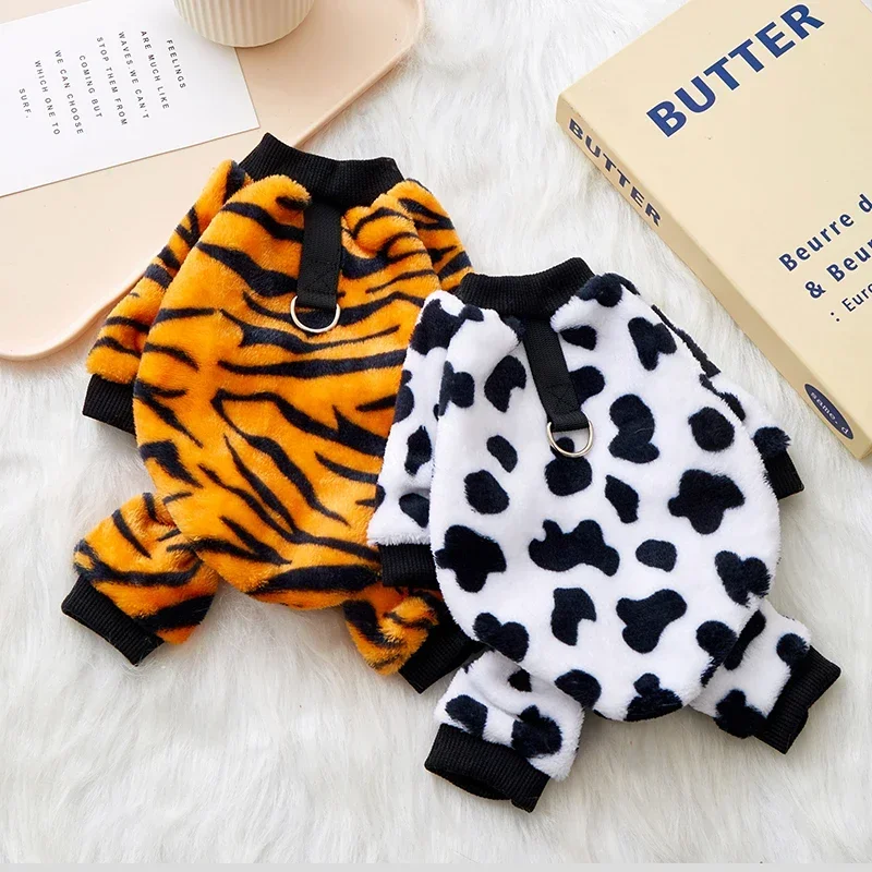 Confeccionado con franela de primera calidad para brindar máxima suavidad y calidez, este traje de cuerpo completo de cuatro patas es perfecto para perros pequeños y medianos.El adorable estampado híbrido de vaca-tigre combina fantasía y estilo, mientras que el diseño elástico alrededor de las articulaciones permite un movimiento natural.Resistente al viento y acogedor, mantiene a tu mascota cómodamente a la moda durante los días fríos.