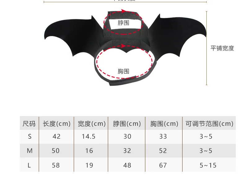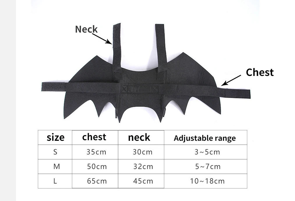 Material: algodón, felpa Color: negro TAMAÑO: S:41*16*0,6 cm M: 48*20*0,6 cm L:55*25*0,7 cm Tamaño de la campana: 2,9*2,5 c m USOS: Accesorios para mascotas, decoración de festivales. Lista de paquetes: 1 ala de murciélago artificial Notas: 1.Puede haber una diferencia de 1-2 mm debido a la medición manual. 2. El color real puede diferir ligeramente de las imágenes debido a la pantalla del ordenador.