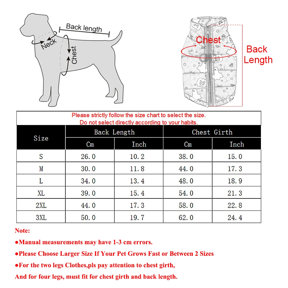 Note:Manual measurements may have 1-3 cm errors.Please Choose Larger Size If Your Pet Grows Fast or Between 2 Sizes For the two legs Clothes,pls pay attention to chest girth,And for four legs, must fit for chest girth and back length.Due to the light and screen difference, the item's color may be slightly different from the pictures. Please understand. Make sure you don't mind before you bid.