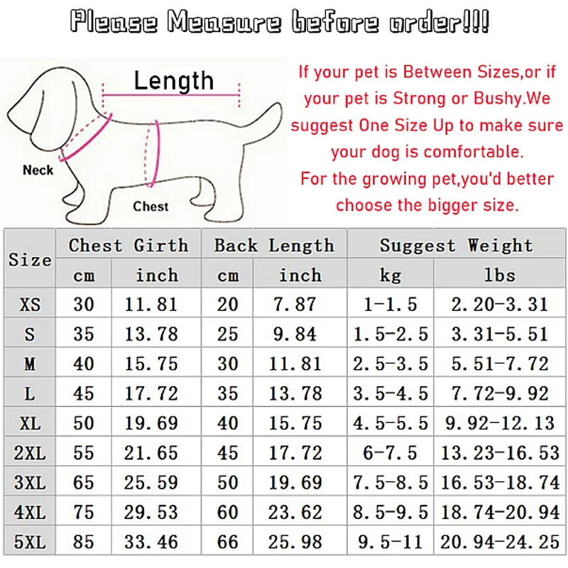 5XL Pecho 85 cm/33,46 '' Largo 66 cm/25,98 '' Peso sugerido 9,5-11 kg/20,94-24,25 lbs
