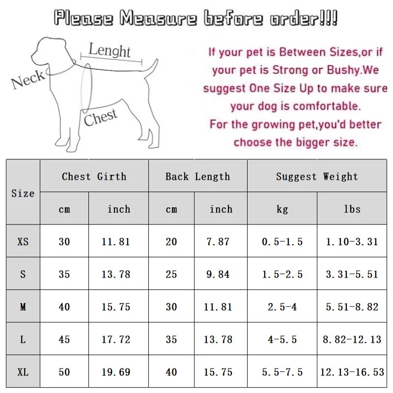 S: Pecho 35cm/13,78''; Longitud 25 cm/9,84''; Peso sugerido: 1,5-2,5 kg/3,31-5.51 libras.