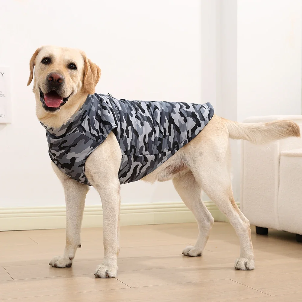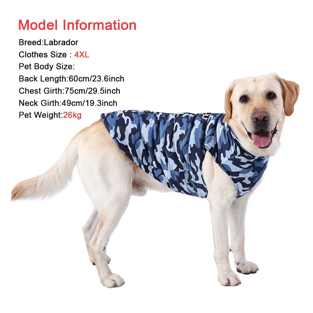 Ropa de invierno para mascotas, chaqueta cálida a prueba de viento para perros grandes, abrigo para perros medianos y grandes, disfraz de camuflaje con estampado dorado, trajes de recuperaciónProducto: chaqueta para perro grandePatrón: camuflajeColor: verde, azul marino, negroSoporte: dropshipping y venta al por mayorCaracterística: resistente al viento e impermeable, cálido y acogedor, diseño de anillo en DAdecuado para: perros medianos y grandes (recogedor dorado, recuperador de labrador, pastor alemán)Tamaño:4XL: Longitud de la espalda: 55 cm/21,7 pulgadas; Circunferencia del pecho: 76 cm/29,9 pulgadas; Circunferencia del cuello: 49 m/19,3 pulgadas; Peso sugerido 20-26 kg (44,1-57,3 lb)5XL: Longitud de la espalda: 65 cm/25,6 pulgadas; Circunferencia del pecho: 92 cm/36,2 pulgadas; Circunferencia del cuello: 58 m/22,8 pulgadas; Peso sugerido 26-36 kg (57,3-79,4 lb)6XL: Longitud de la espalda: 70 cm/27,6 pulgadas; Circunferencia del pecho: 100 cm/39,4 pulgadas; Circunferencia del cuello: 63 cm/24,8 pulgadas; Peso sugerido 36-46 kg (79,4-101,4 lb)Nota:
