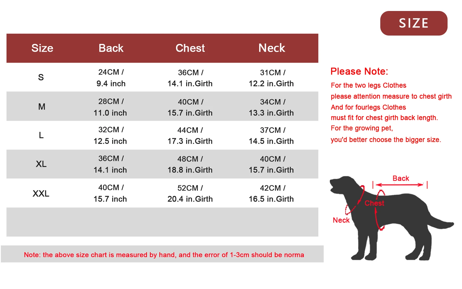 XXL: Longitud de la espalda: 40cm/15,7 pulgadas, circunferencia del pecho: 52cm/20,4 pulgadas, circunferencia del cuello: 42cm/16,5 pulgadas