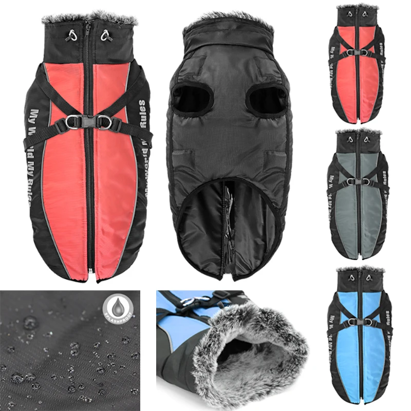 Ropa de invierno para perros, abrigo reflectante grueso para perros, chaleco con arnés, ropa impermeable para mascotas, Cuello de piel, chaqueta para perros grandes