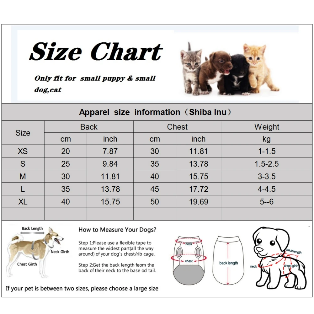 Tallas completas: XS, S, M, L, XL para diferentes razas