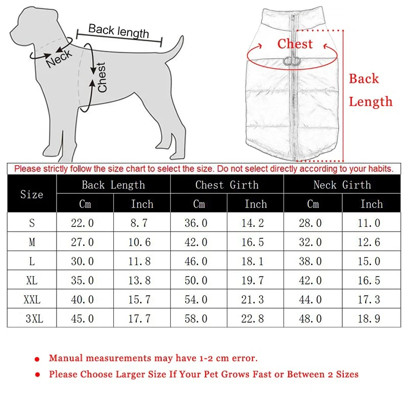XXL: Longitud de la espalda: 40 cm/15,7 pulgadas; Circunferencia del pecho: 54 cm/21,3 pulgadas; Circunferencia del cuello: 44 cm/17,3 pulgadas;