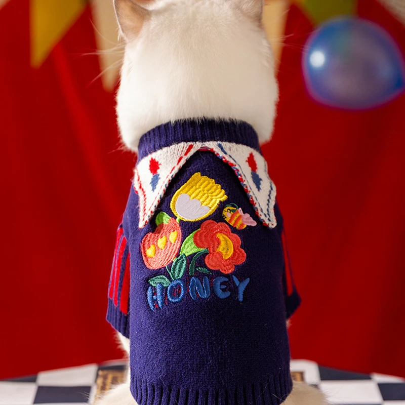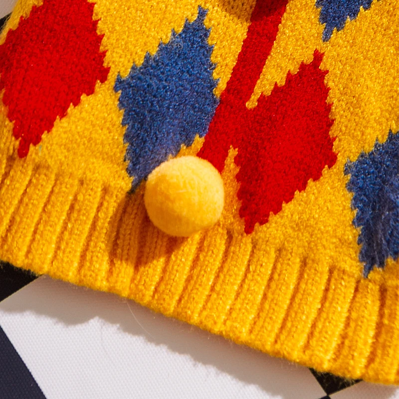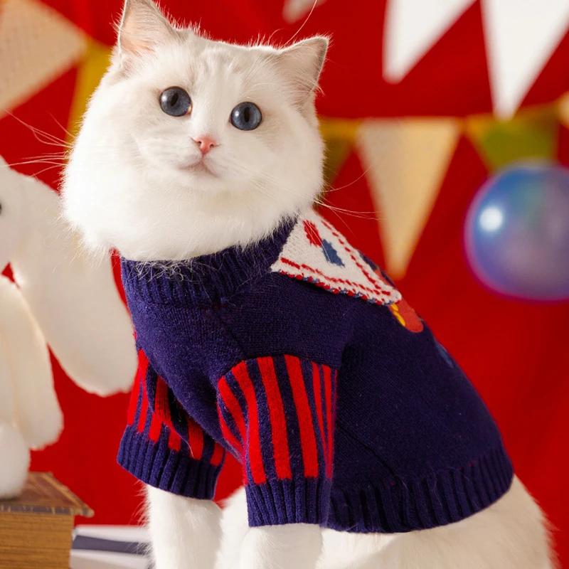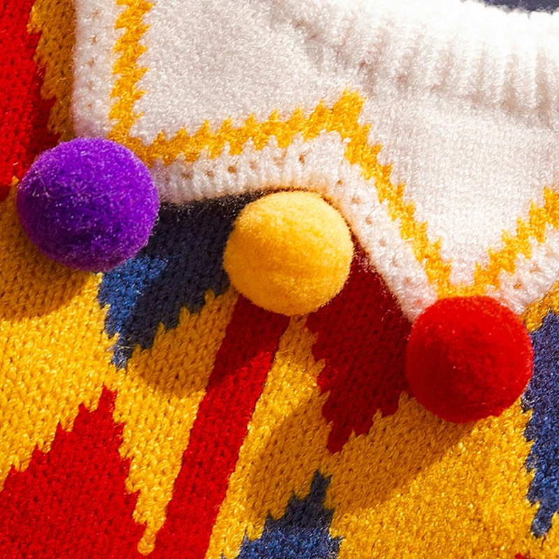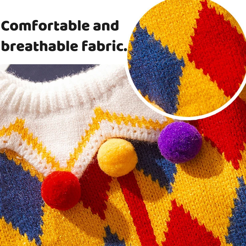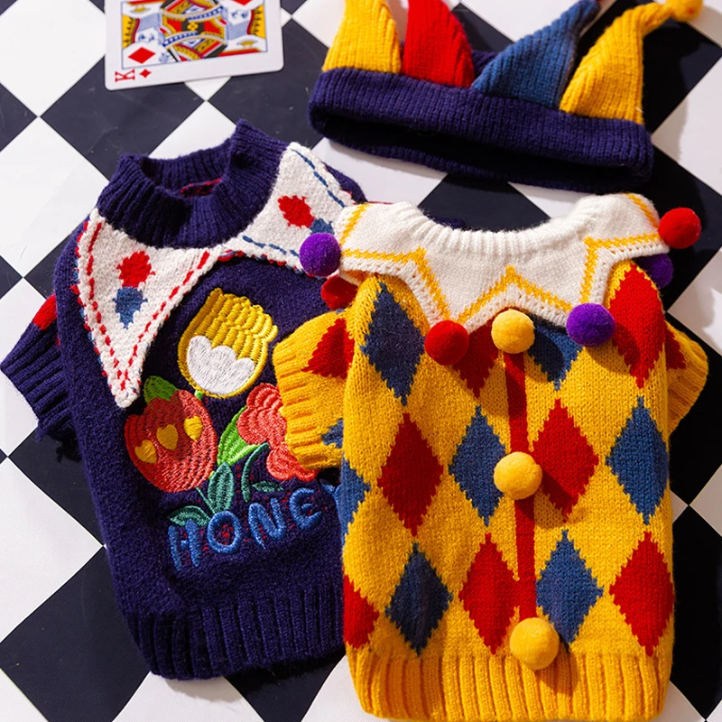 Ropa de invierno para perros, suéter de moda para perros con sombrero de payaso de circo, suéter tejido bonito a cuadros para cachorros, cuello alto suave y cálido para gatos