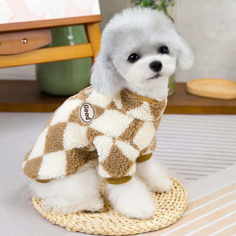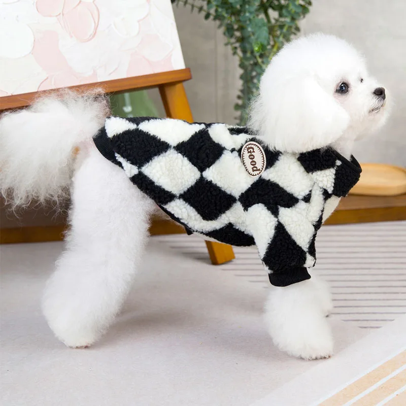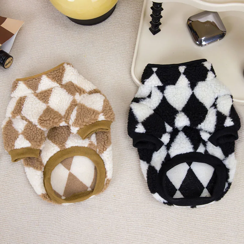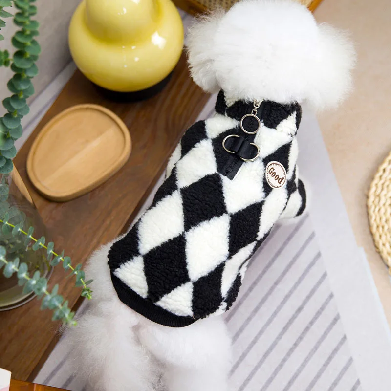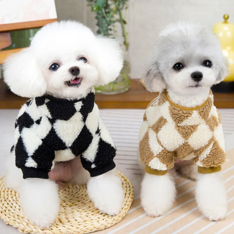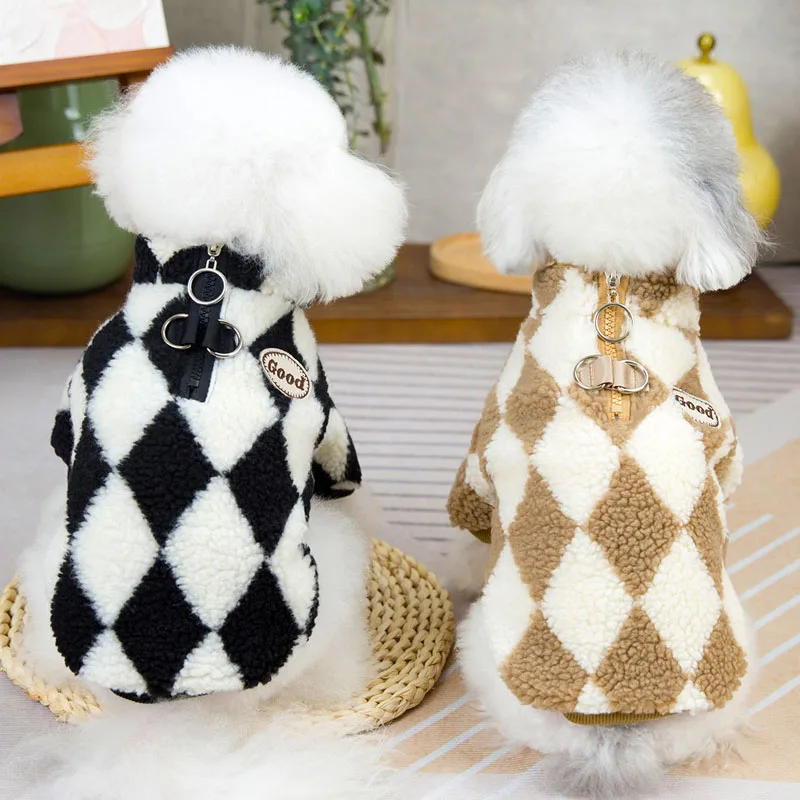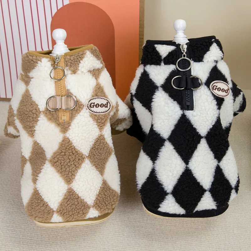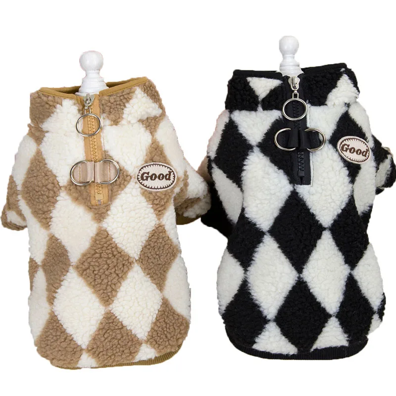 Ropa de lana para mascotas con rombos, sudaderas con capucha y cremallera en negro y marrón para invierno, abrigo para perros, Shih Tzu Chiwawawa, sudadera para cachorros y gatos, chaqueta XXL
