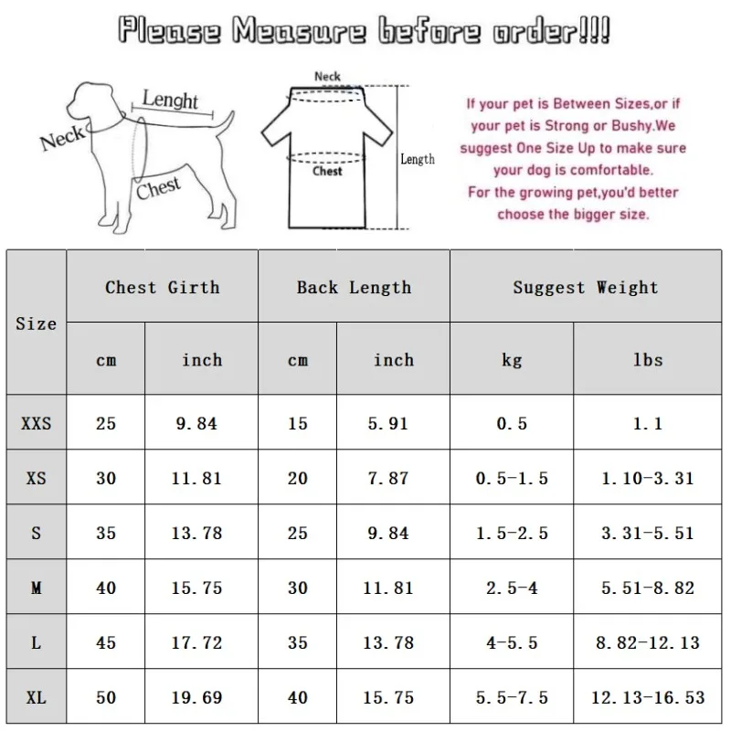 XS: Pecho 30 cm/11,81 ''; Longitud 20 cm/7,87 ''; Peso sugerido 0,5-1,5 kg/1,10-3,31 lbs.