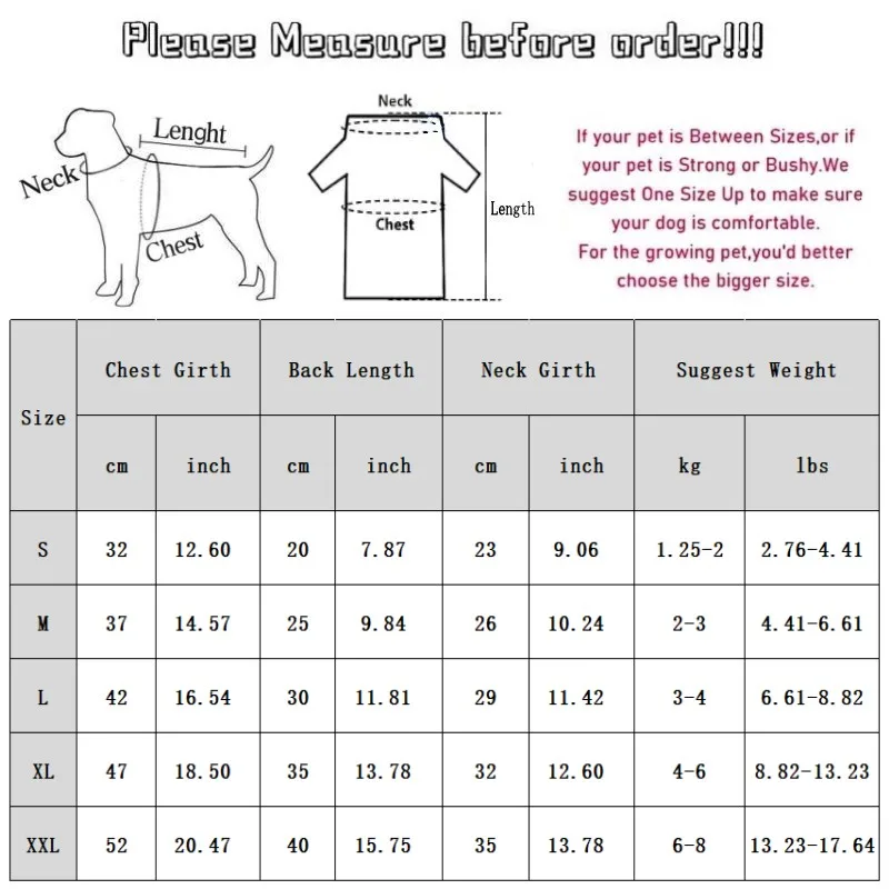 XXL: Pecho 52cm/20,47''; Longitud 40cm/15,75''; Cuello 35cm/13,78''; Peso sugerido 6-9 kg/13,23-17,64 libras.