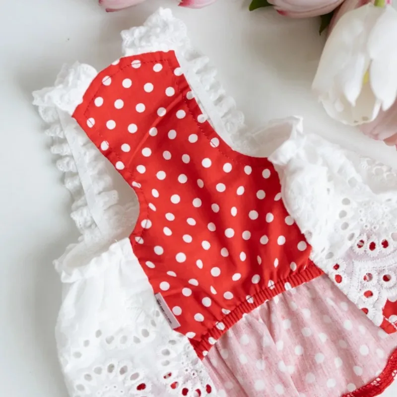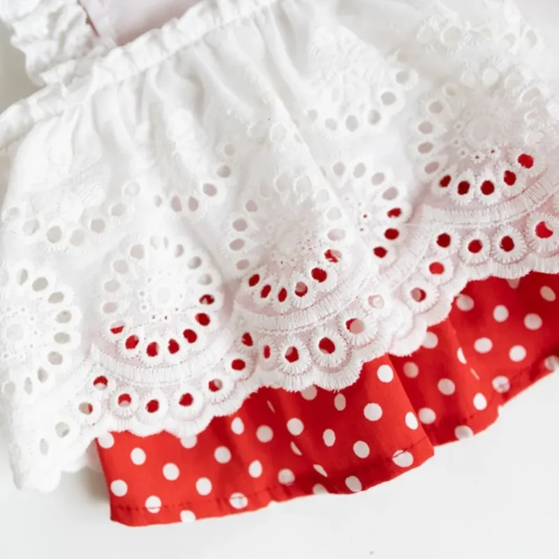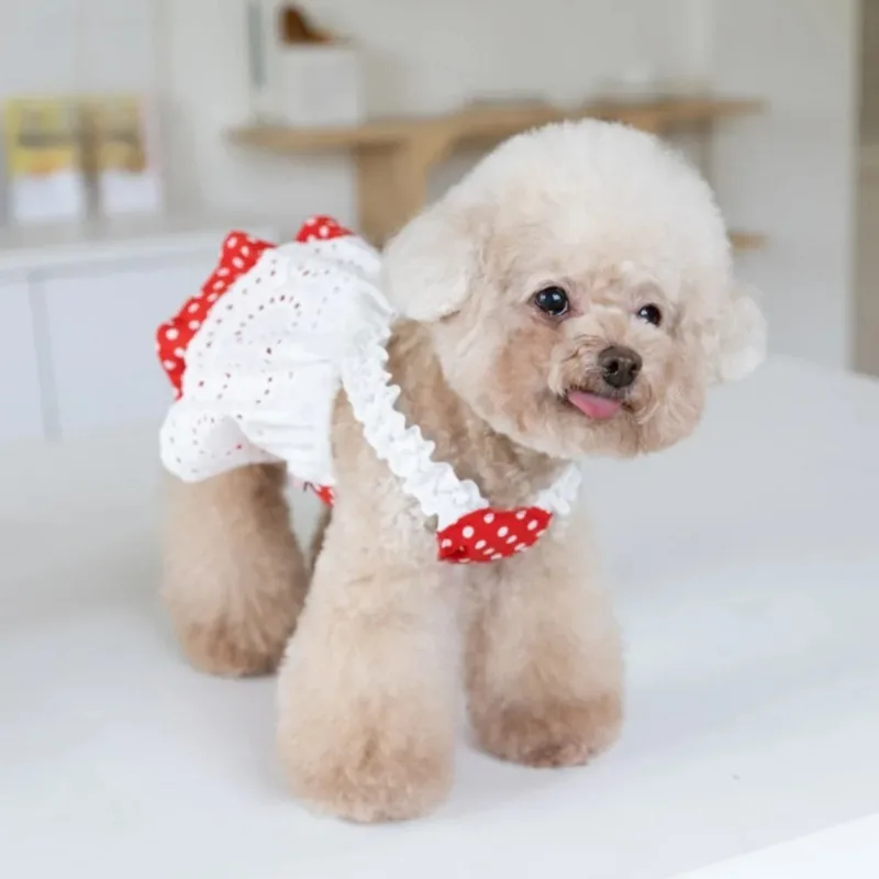 Ropa de lunares rojos para mascotas, vestidos de verano para cachorros, falda con tirantes huecos, falda plegable para perros, falda con lazo de peluche para perros pequeños, chaleco fino de princesa a la moda