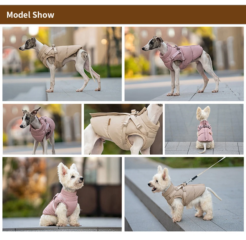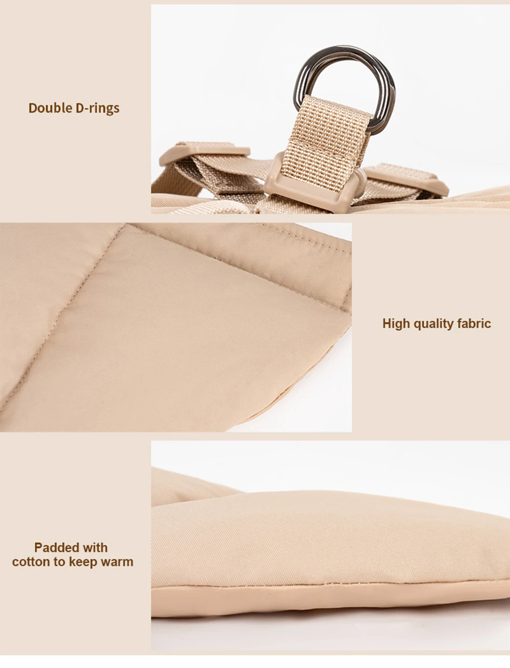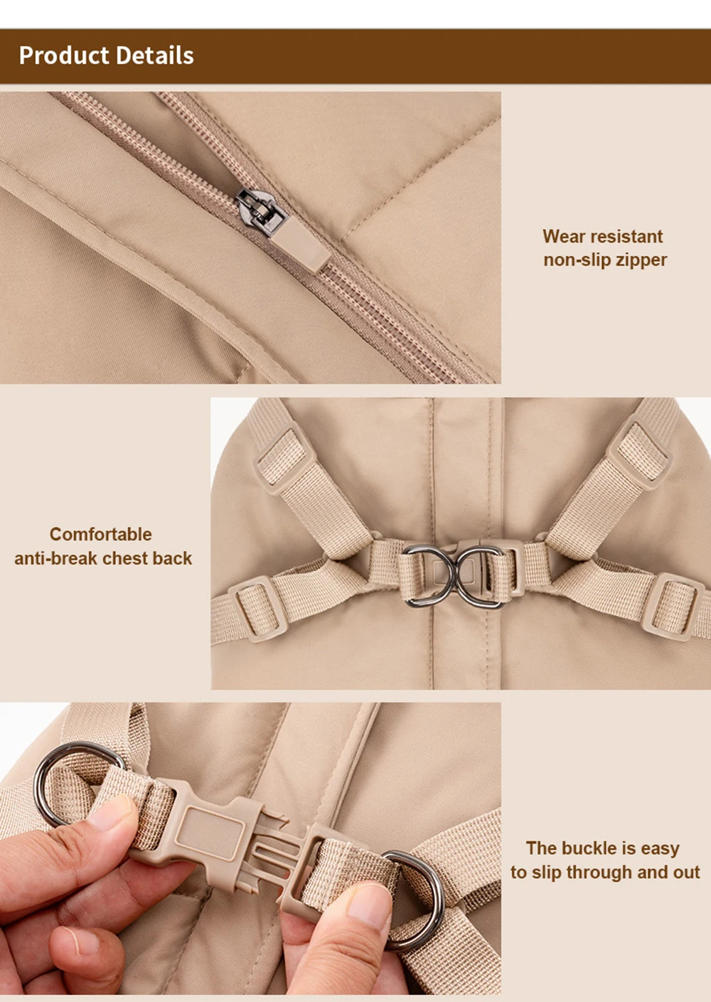 Cuenta con un arnés incorporado, que permite sujetar fácilmente la correa y caminar de forma segura, mejorando la funcionalidad de la chaqueta.