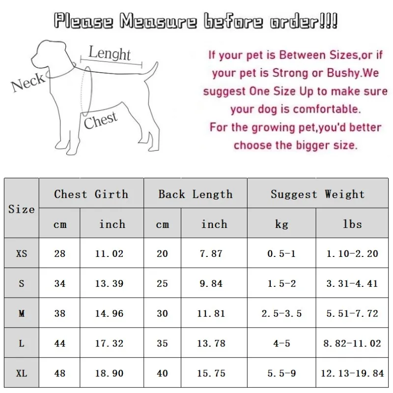 XL: Pecho 48 cm/18,9 ''; Longitud 40 cm/15,75 ''; Peso sugerido 5,5-9 kg/12,13-19,84 lbs.