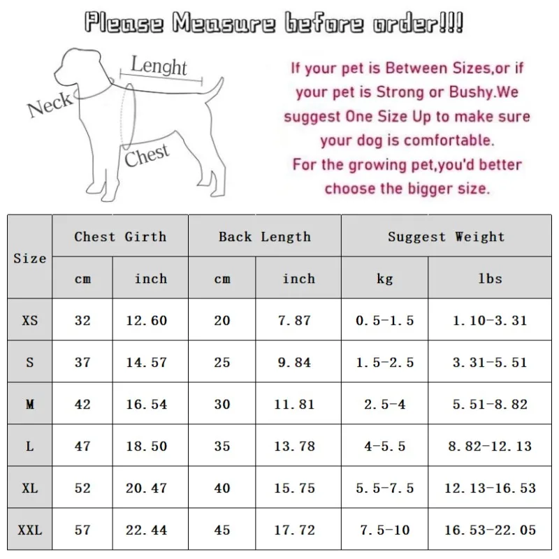 XXL: Pecho 57cm/22,44''; Longitud 45cm/17,72''; Peso sugerido 7,5-10 kg/16,5-22.05 lbs.