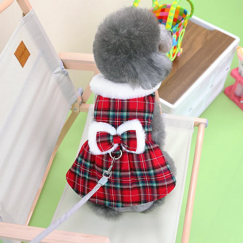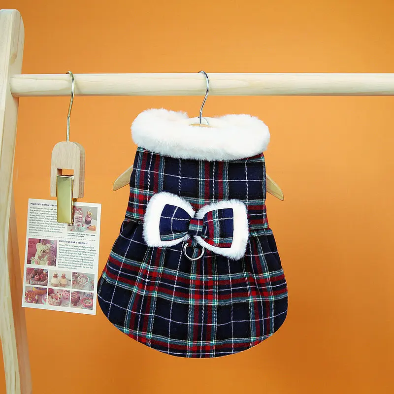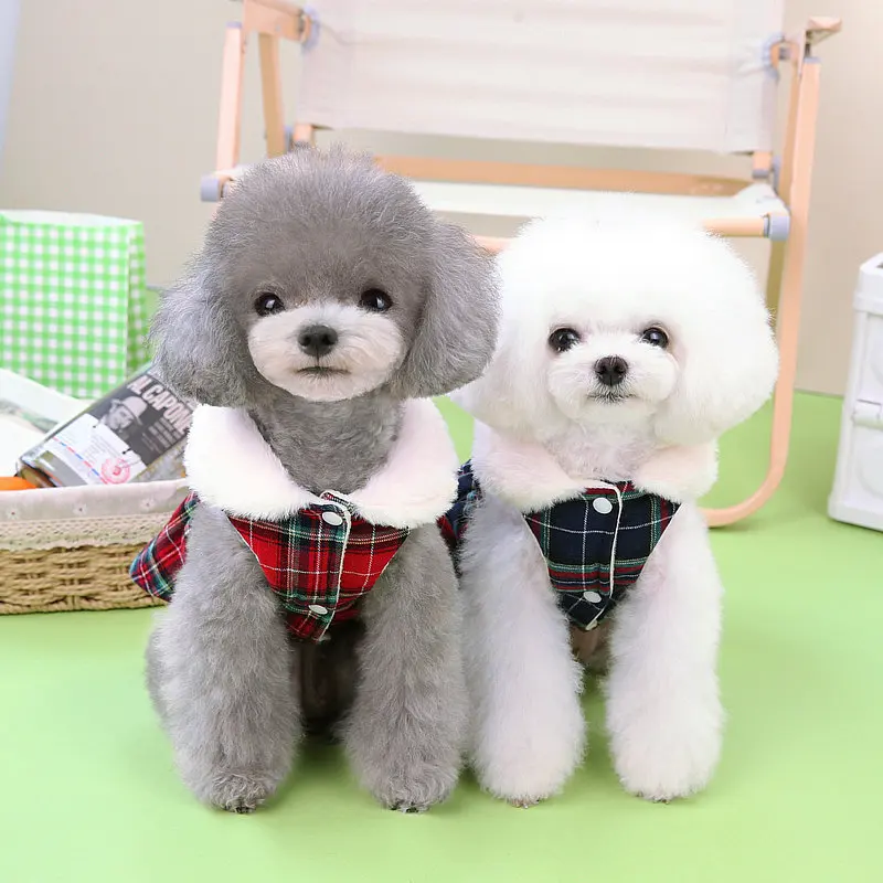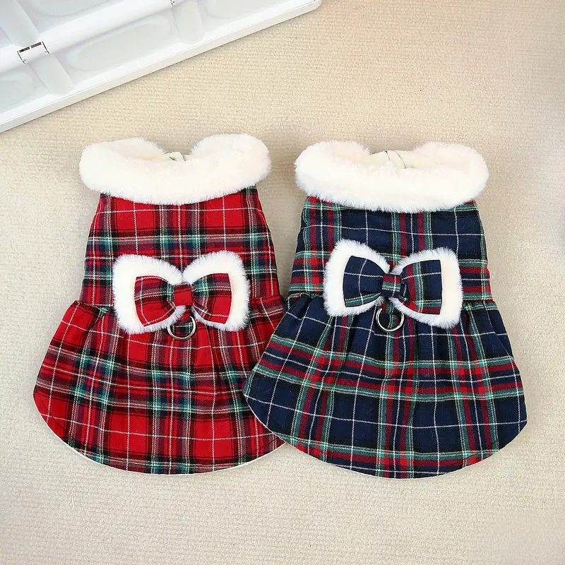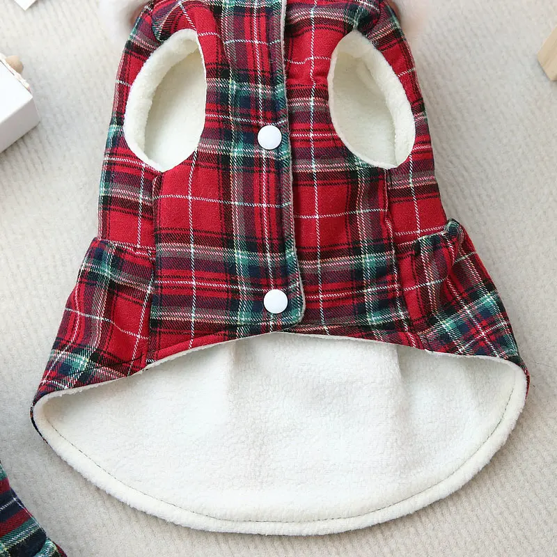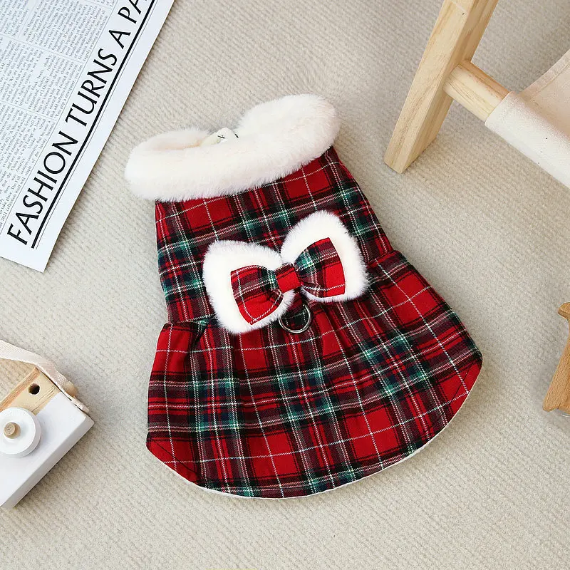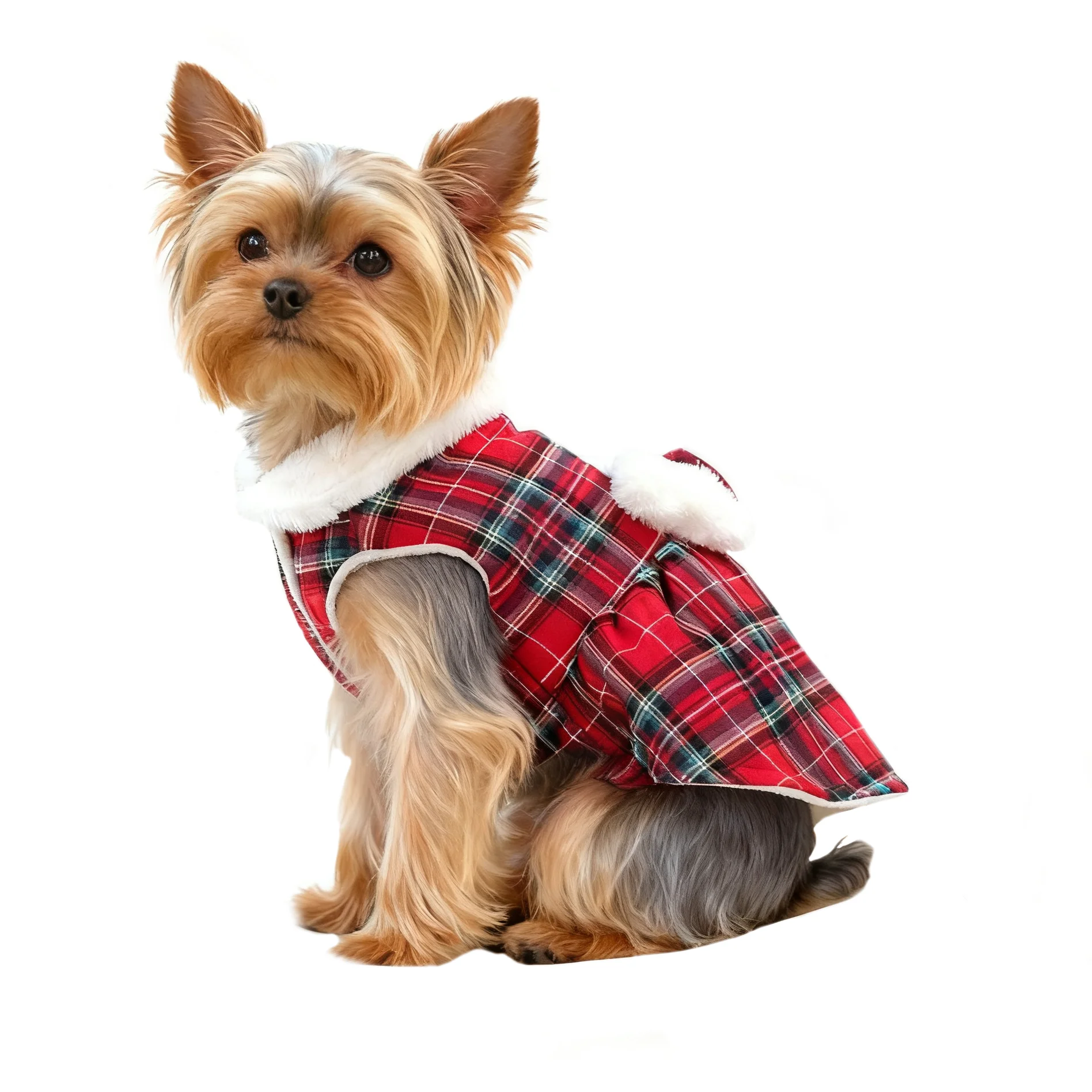 Ropa navideña a cuadros para perros, vestido térmico de invierno con forro polar cálido para perros con cuello de piel sintética de lujo para perros pequeños, cachorros y York