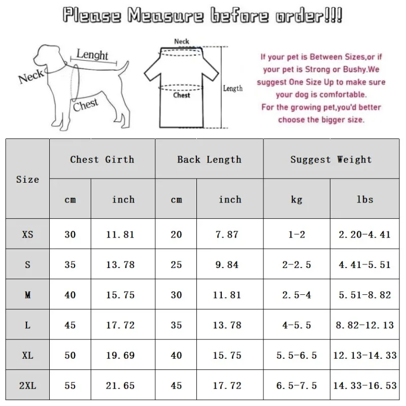 2XL: Pecho 55 cm/21,65''; Longitud 45 cm/17,72 pulgadas; Peso sugerido 6,5-7,5 kg/14,33-16.53 lbs.