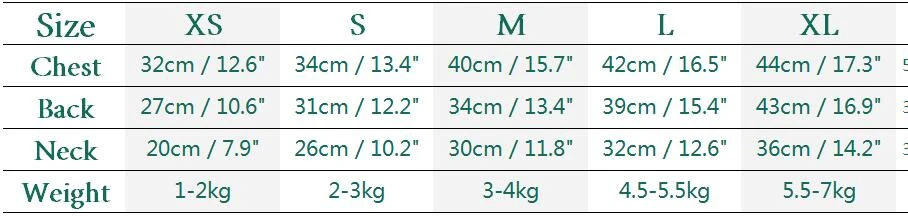 XS: pecho: 32cm/12,6 '', espalda: 27cm/10,6'', cuello: 20cm/7,9 '',
