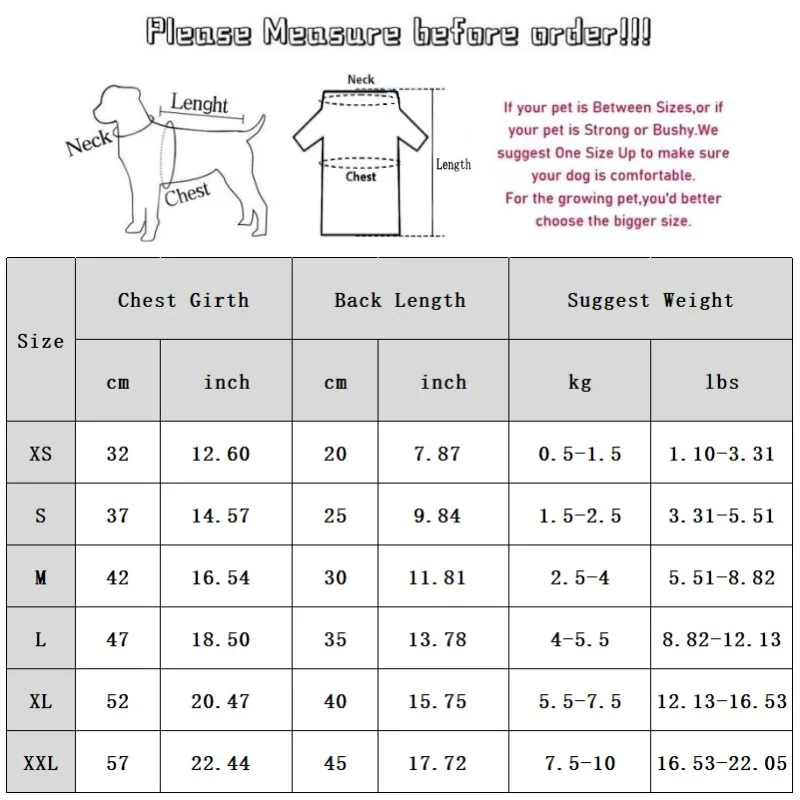 S: Pecho 37cm/14,57''; Longitud 25 cm/9,84''; Peso sugerido: 1,5-2,5 kg/3,31-5.51 libras.