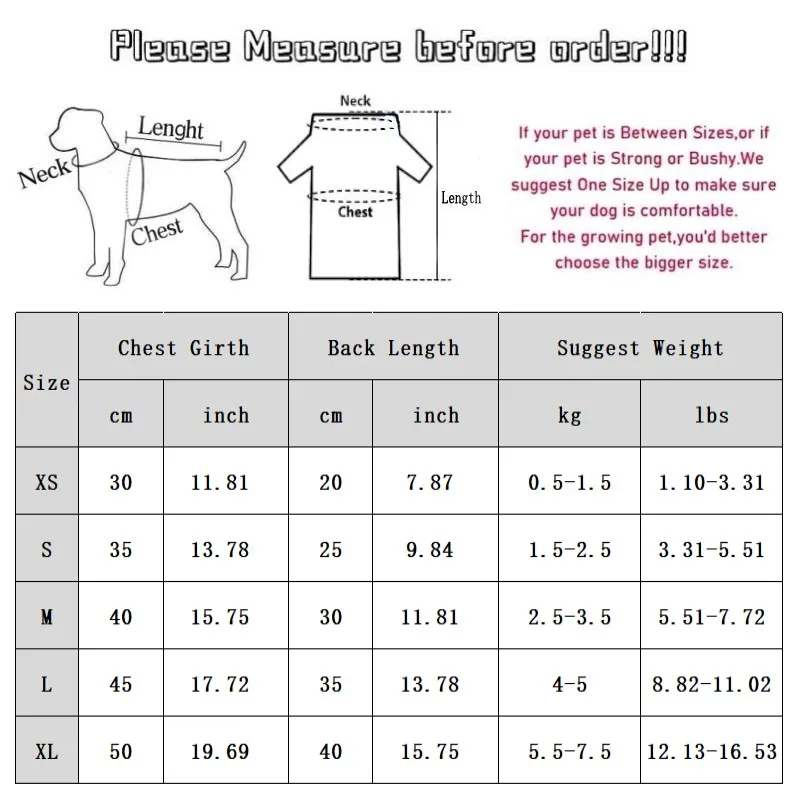 S: Pecho 35cm/13,78''; Longitud 25 cm/9,84''; Peso sugerido: 1,5-2,5 kg/3,31-5.51 libras.