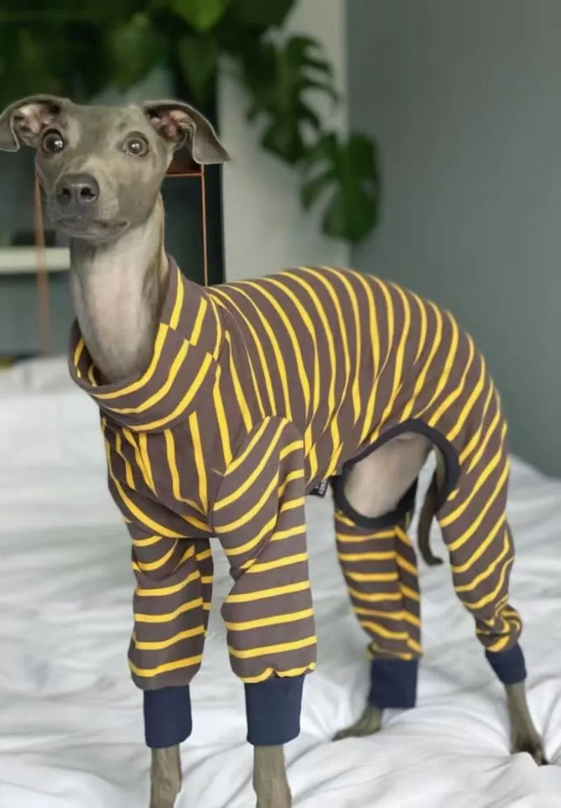 Description: * The onesie features a convenient walk-in four-legged design to ensure your dog is easy to wear. In addition, the open back design allows your dog to easily use the toilet * Can be easily machine washed at 30 ° C. Classic stripes can provide more inspiration for wearing and matching on different occasions. ★Designed specifically for ltalian Greyhounds, Greyhounds, and Whippets.