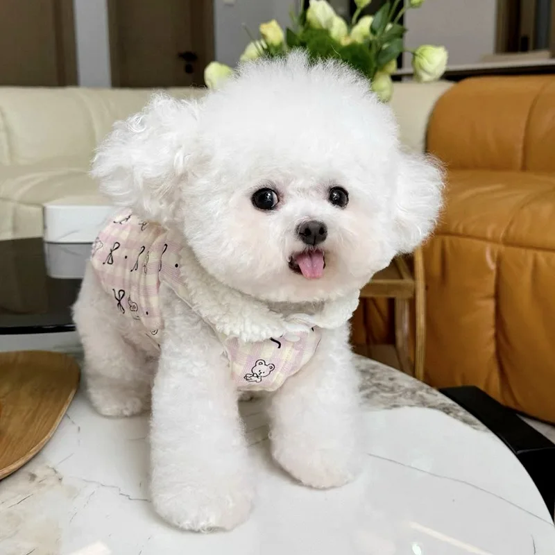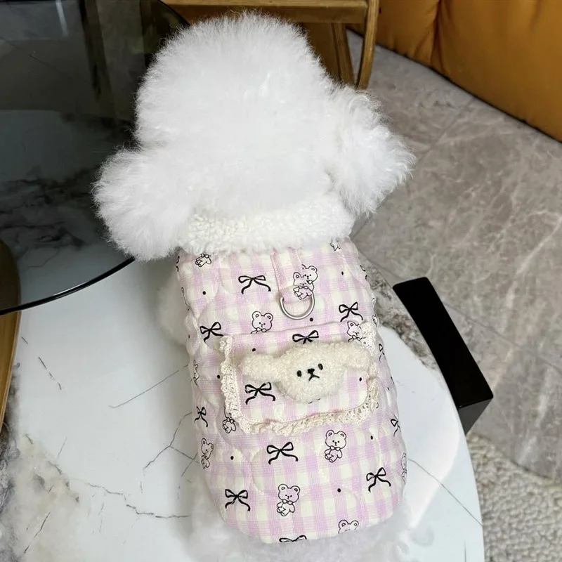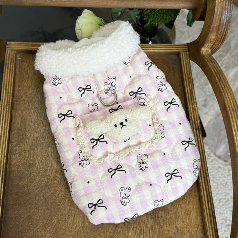 Ropa para perros con diseño de lazo clásico bonito para mascotas, abrigo de algodón grueso para mascotas, monos cálidos de cuatro patas con hebilla de tracción para invierno