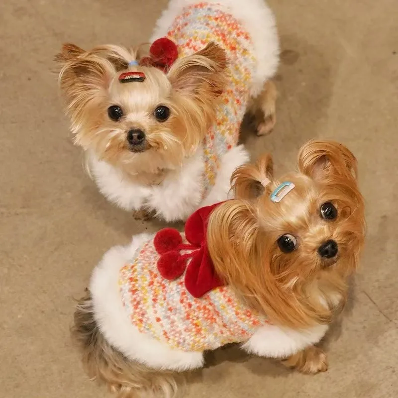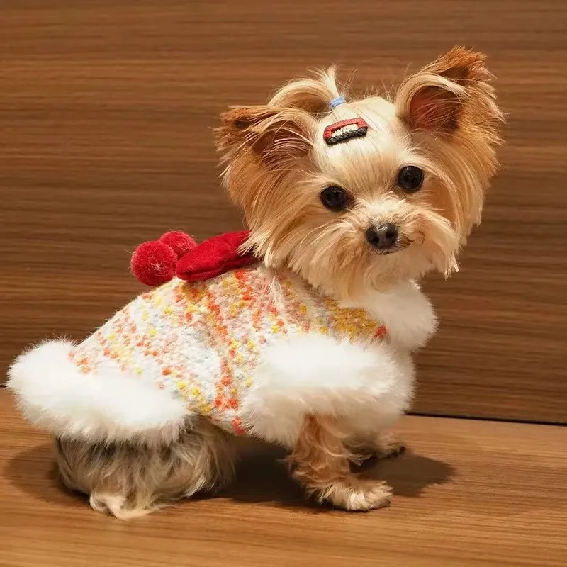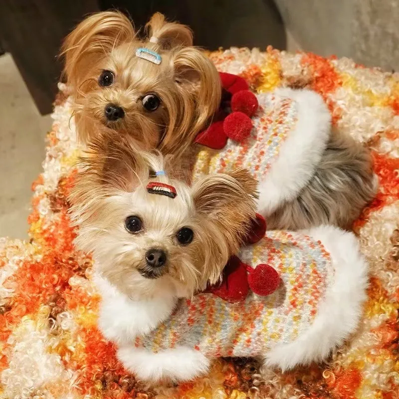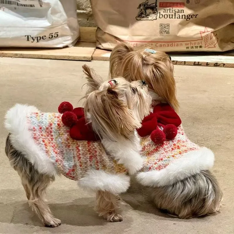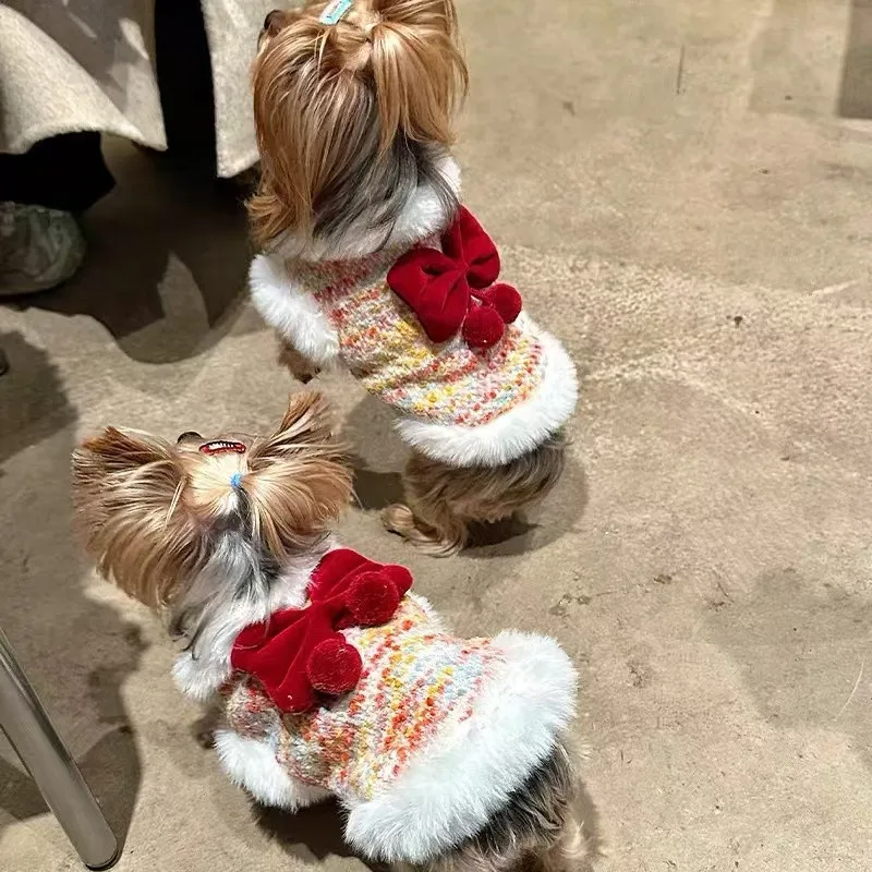 Ropa para perros y gatos, abrigo con cuello de felpa con lazo de Año Nuevo, Top sin mangas para otoño/invierno, oso de peluche, perro pequeño, Yorkshire para perros pequeños