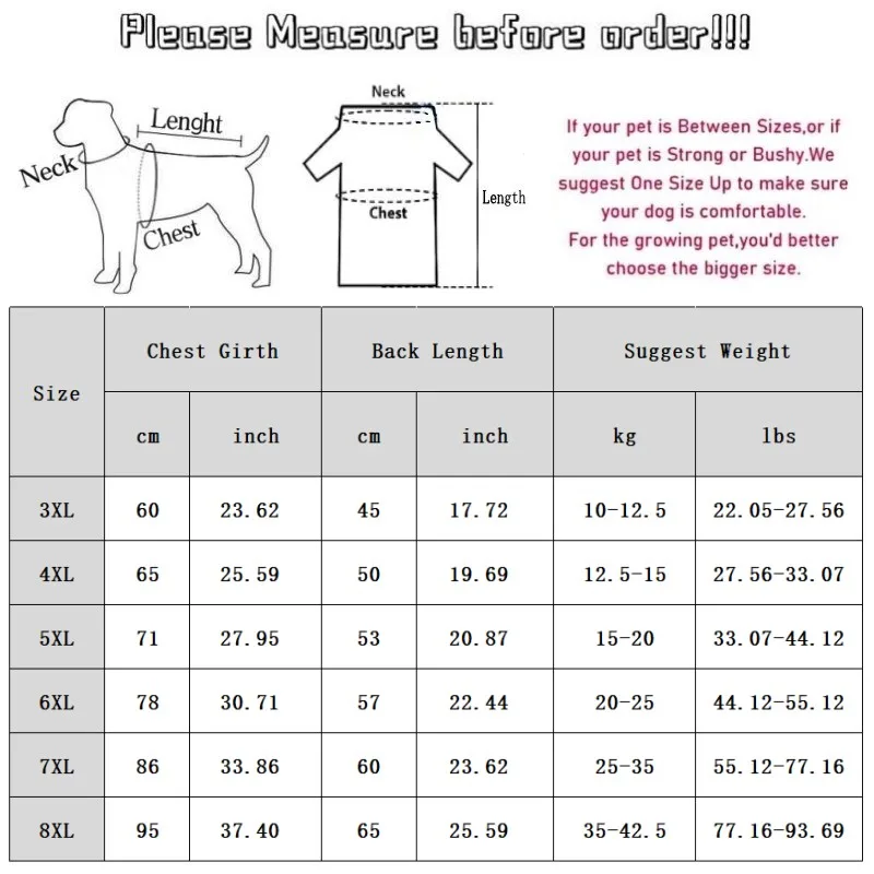 3XL: Pecho 60cm/23,62''; Longitud 45cm/17,72''; Peso sugerido 10-12.5 kg/22,05-27.56 lbs.